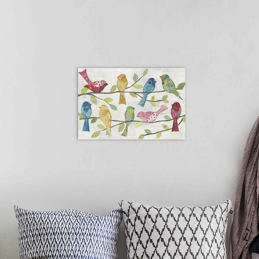 Colorful patchwork birds sitting on branches.