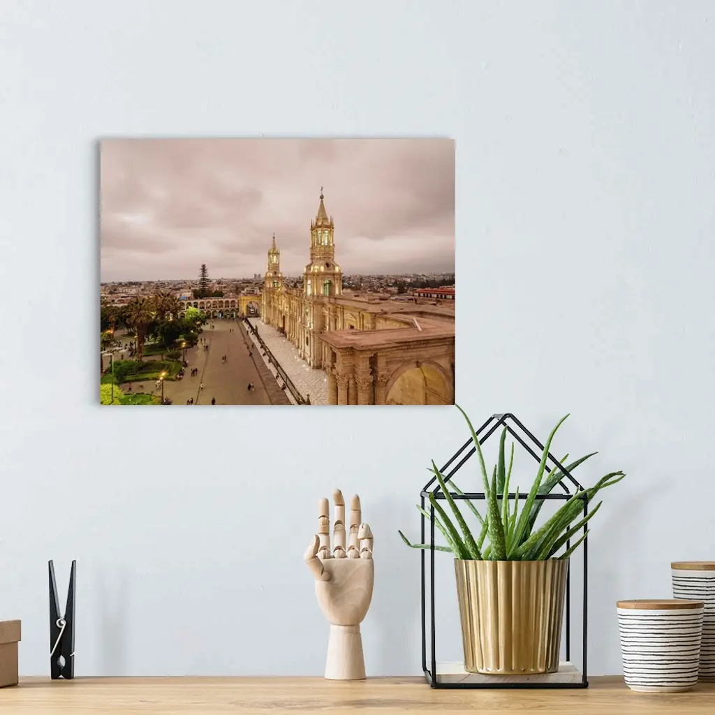 Cathedral at twilight, Plaza de Armas, elevated view, Arequipa, Peru