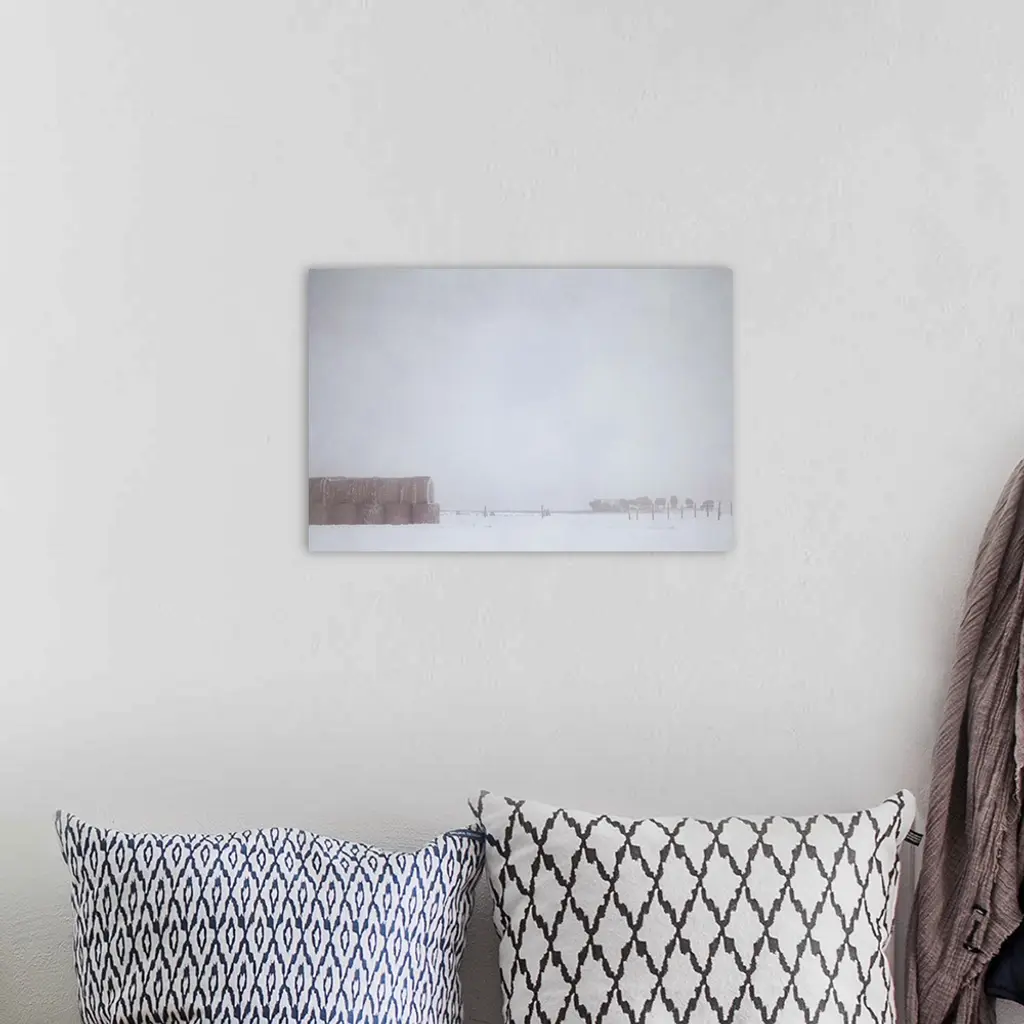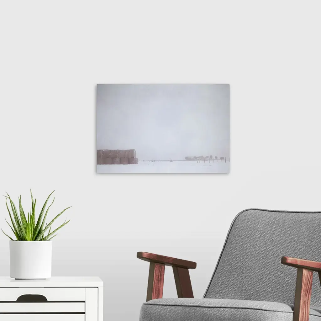 Pictorialist photo of a small herd of cattle in the pen during feeding time on a foggy winter day.
