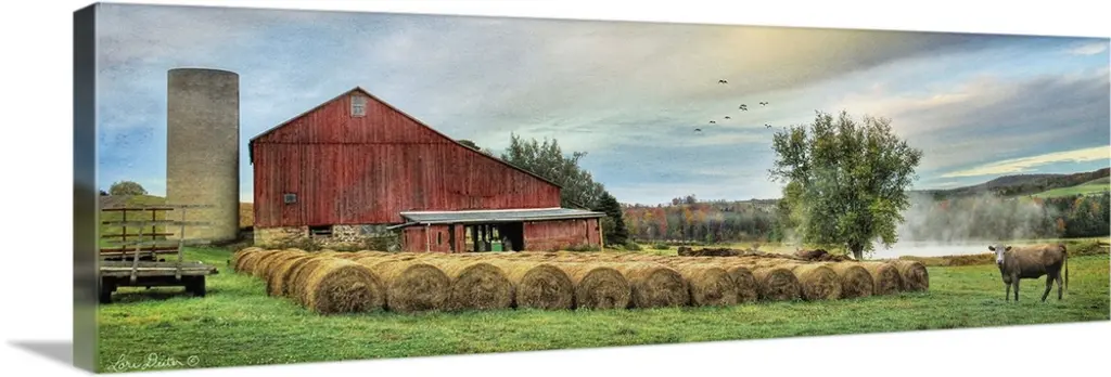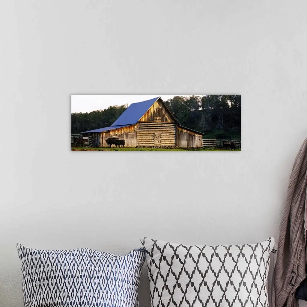 Large, horizontal photograph of several cattle grazing in front of an old barn, a dense tree line in the background.