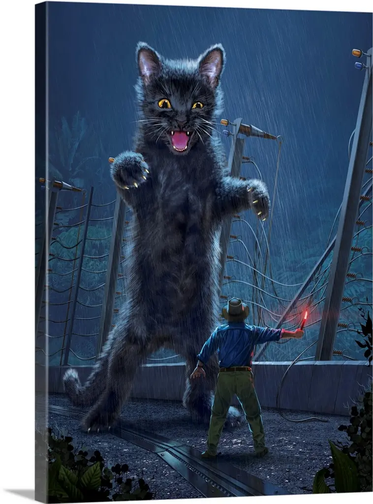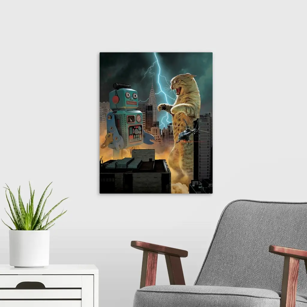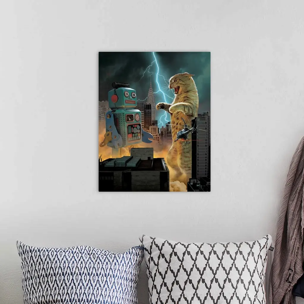 Catzilla vs. Robot wall art for home and office decor. Discover canvas art prints, photos, mural, big canvas art and framed wall art in GreatBigCanvas.com's varied collections.