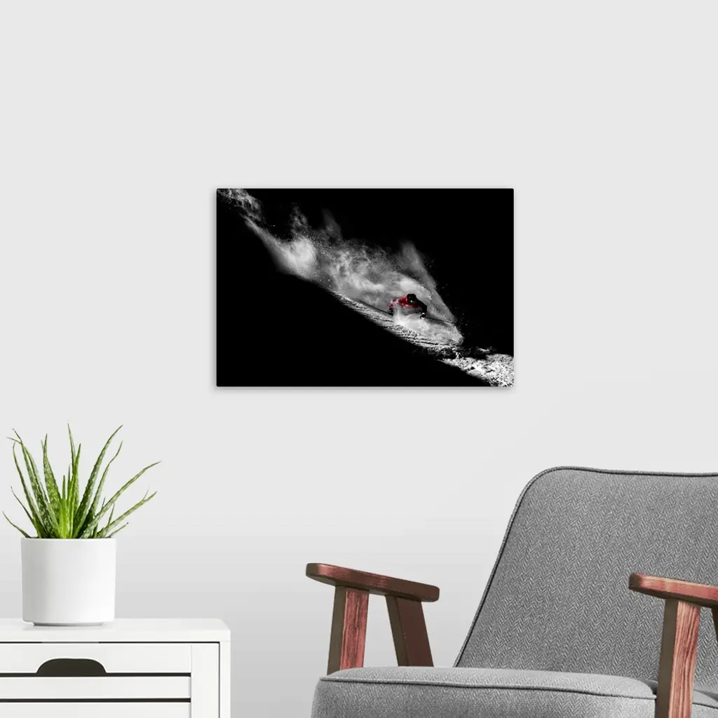 Guerlain Chicherit skis down a mountain in Tignes, France, in a shaft of light.