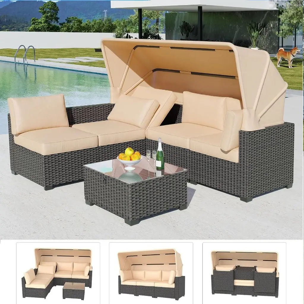 Cavinas 4 Piece Uv-proof Resin Wicker Patio Outdoor Seating Sets, With Retractable Canopy, Cushions And Lifting Table, Beige