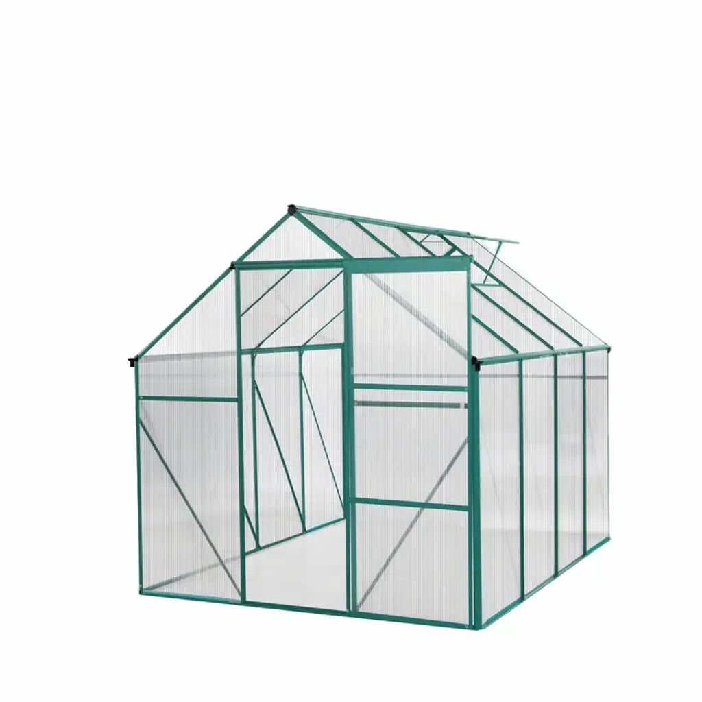 Our greenhouses are equipped with panels with UV coating on the surface, ensuring that your plants are protected from harmful solar radiation while maximizing sunlight exposure, which is essential for healthy plant growth. A variety of plants can be grown inside a greenhouse, whether vegetables, flowers or other plants, all of which can grow in a controlled environment. The greenhouse is equipped with multiple ventilation windows, which can effectively promote air circulation and ensure that the plants have a continuous supply of fresh air. The greenhouse adopts a metal frame structure, which provides good stability and durability. Due to the characteristics of the material, this storage shed is easy to clean and maintain, reducing your maintenance workload and allowing you to enjoy outdoor life more easily.