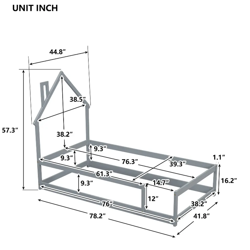 Cavinas Twin Size Bed Frame With House-style Headboard & Fences,modern Floor Bed For Kids Room,bedroom,gray