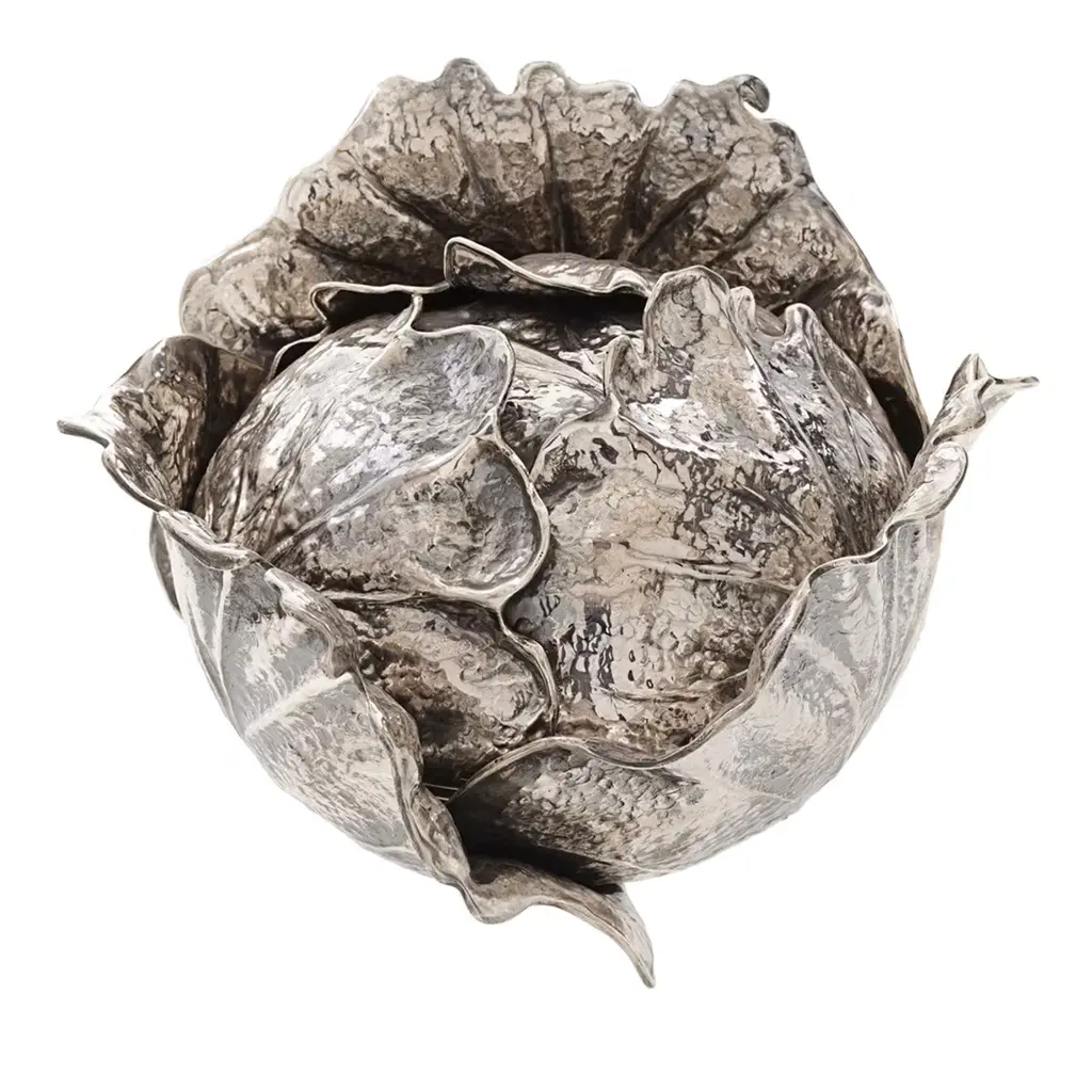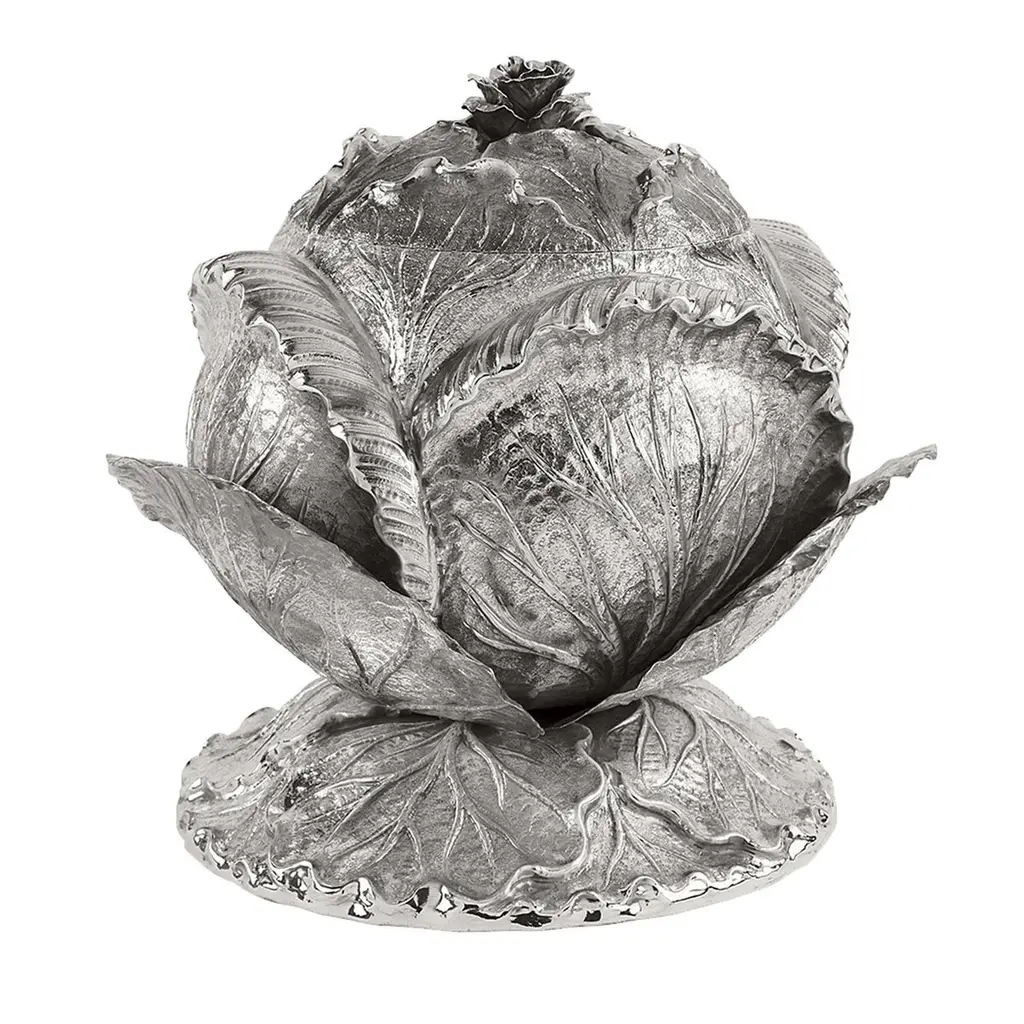 This sumptuous soup terrine is made entirely in silver in the shape of a cabbage, rendered in all its vivid detail. Masterful craftsmanship and a Classic style make this piece a timeless object of functional decor that will instantly enrich any dinner party. The surface of base and body of the piece, including its small lid, are engraved to mimic the texture of the cabbage, while the interior was given a strikingly complementing golden finish.
