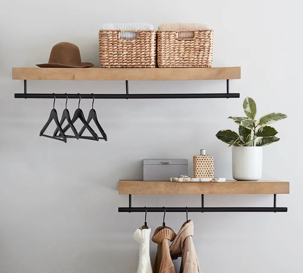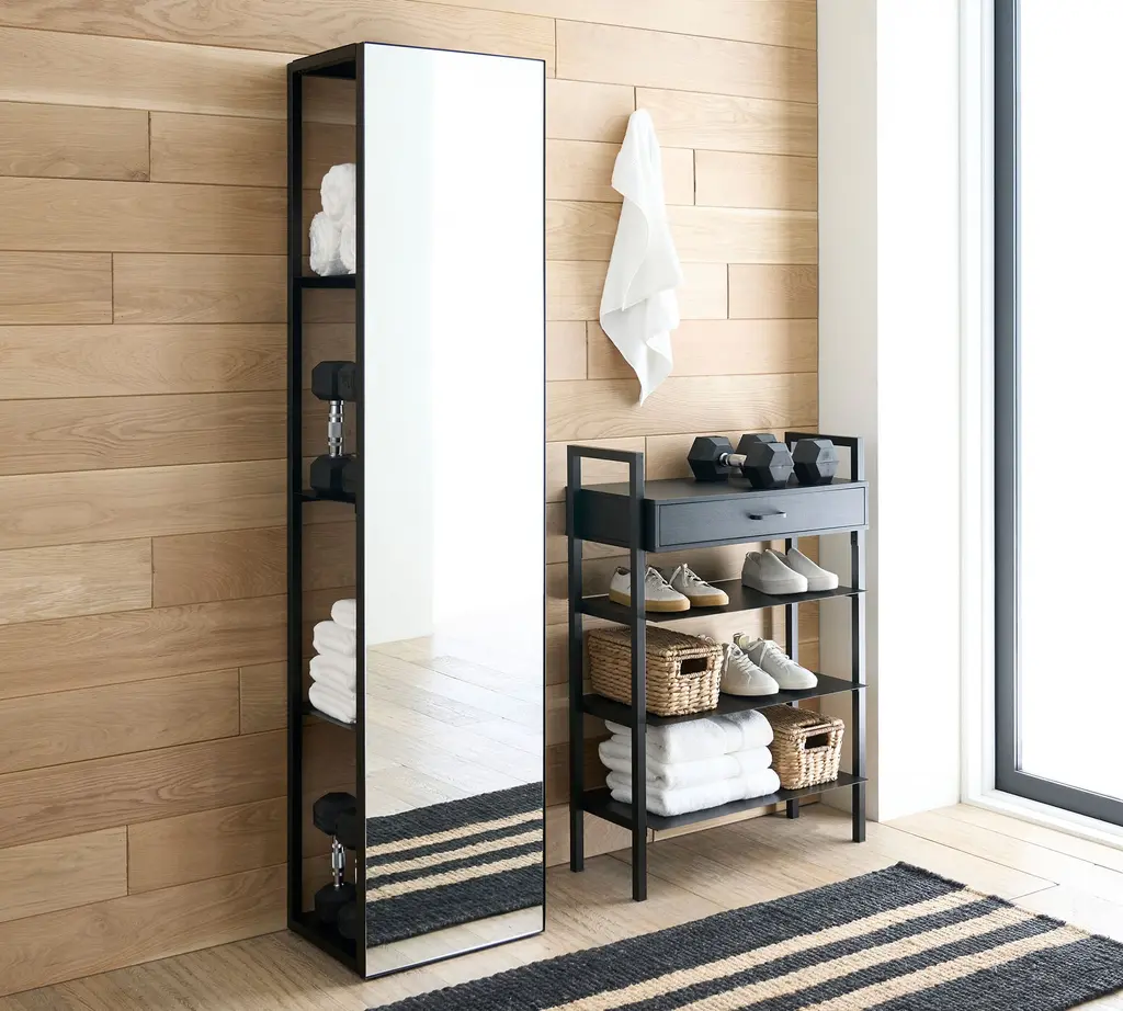 A salute to minimalist design, our Cayman Collection has a timeless look that's warm and welcoming. Crafted of solid wood, each piece has a dimensional finish that adds character. This ultra-functional storage console is the perfect piece for a home gym, but could also work in an entryway. The metal holder fits yoga mats and umbrellas alike.