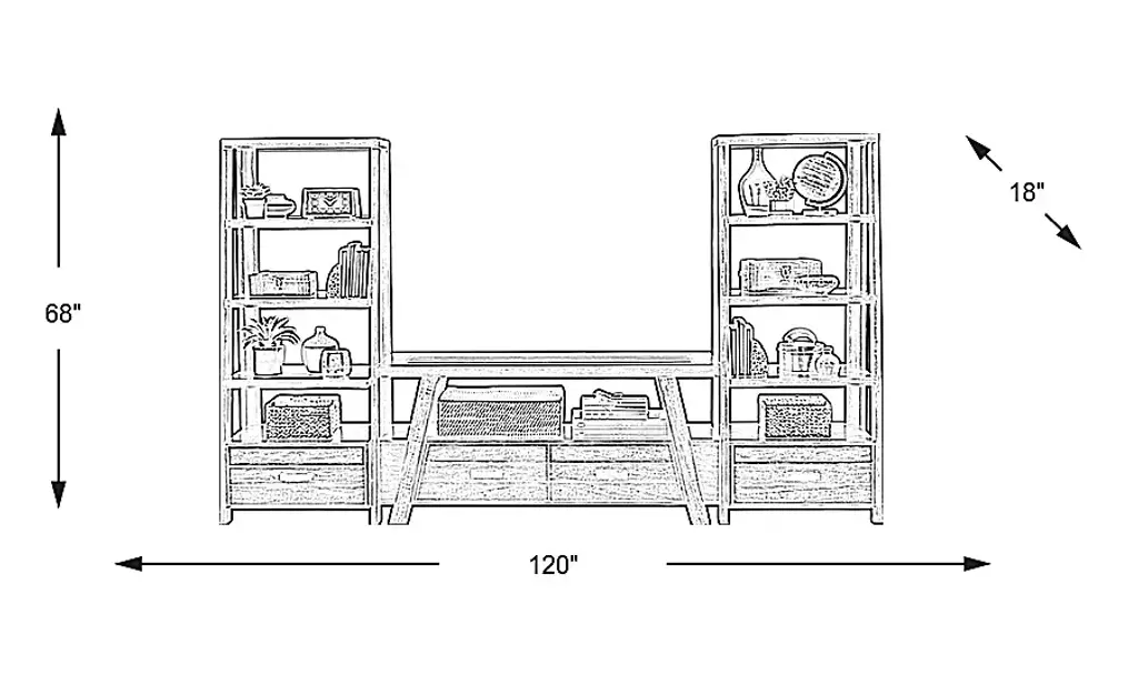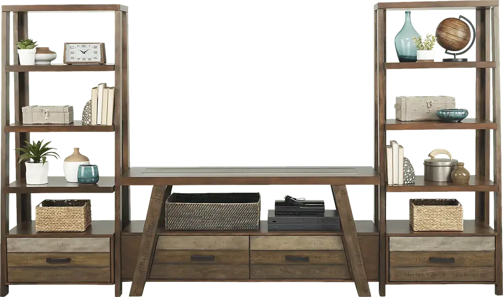Make the most of your space with the rustic contemporary Cedar Creek wall unit. This multi-functional item boasts a 60 inch TV console and two side piers with six display shelves. Crafted with birch veneers, the wall unit has a warm brown finish. Angled legs add to the visual appeal as do the four spacious multi-toned drawers. Customer assembly required.