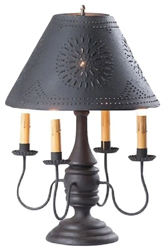 4 candelabra arms, 60 watts max. per socket. Center light has a standard socket, 150 watts max. 3-way switch. Distressed textured paint on the body and textured black paint on the arms and shade.Bulbs Not Included