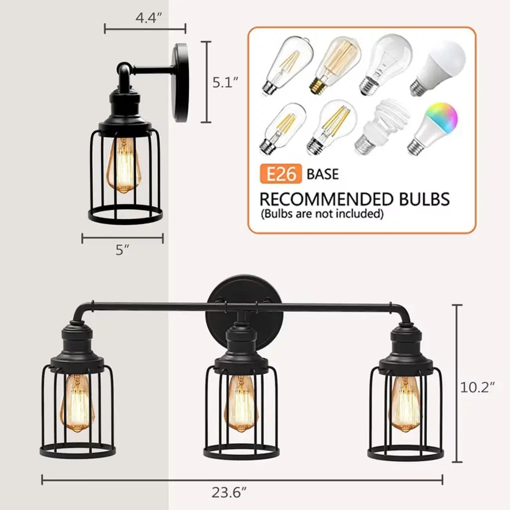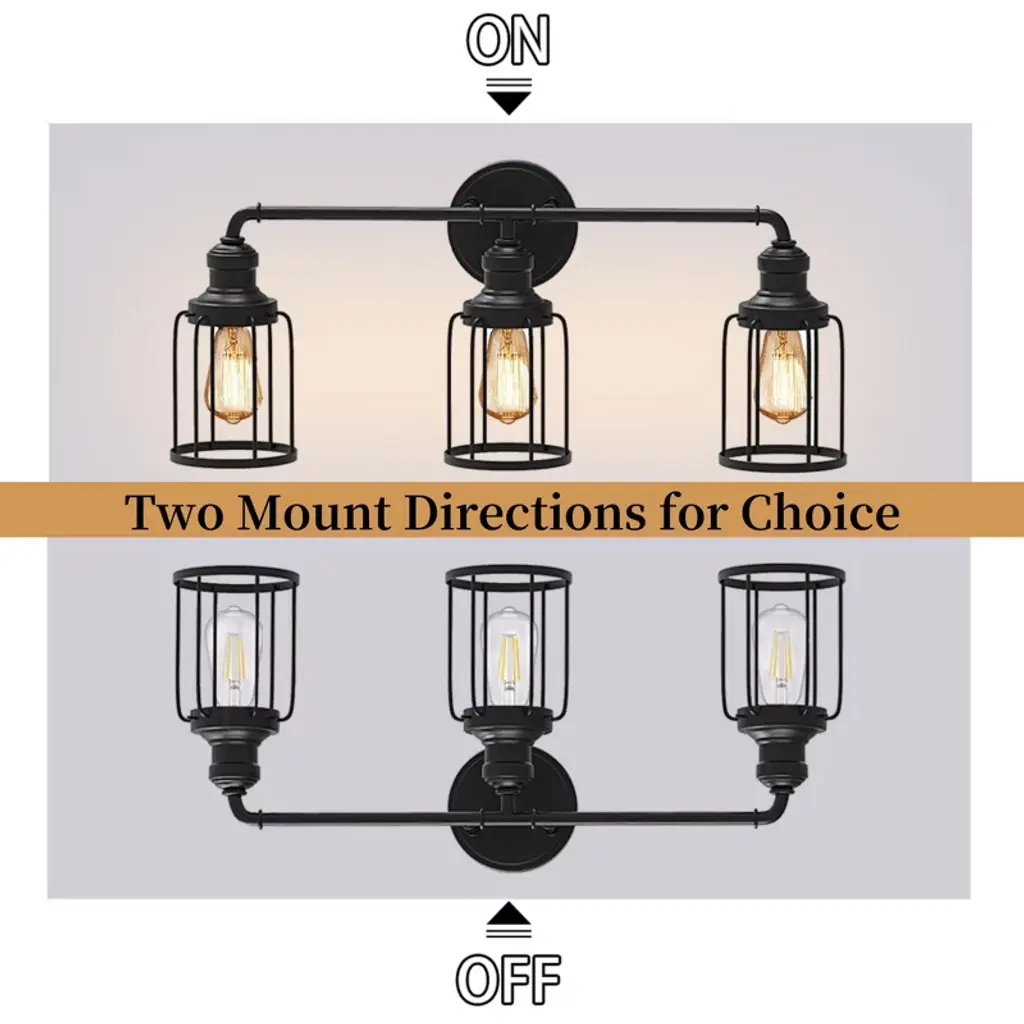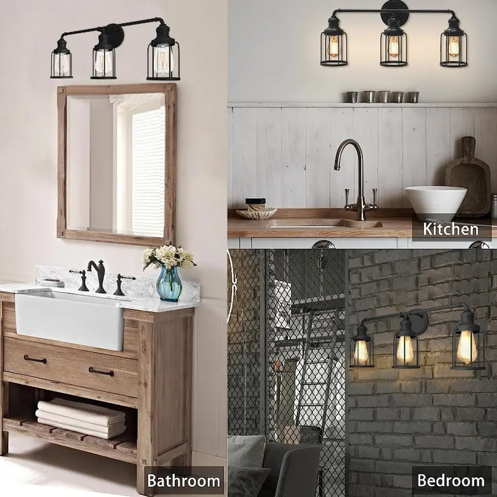 3-Light vanity light with black metal cage design has a retro look. Simple line finish perfect for any decoration style. Crafted with anti-rust materials, it ensures a long lifespan, even in damp environments like bathrooms. Off course,it is also a good choice for living room,bedroom,mirror cabinet and dressing table as a wall sconce.