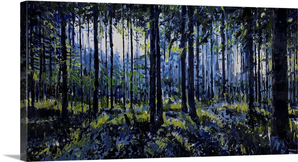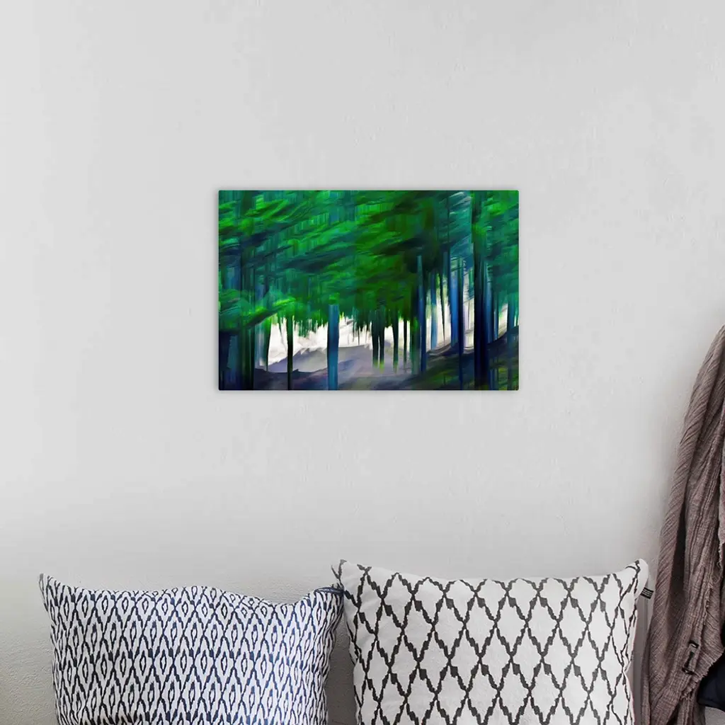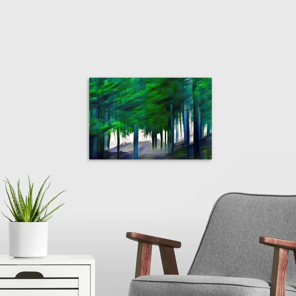 A large group of tall Western cedars on a hike in the mountains in British Columbia, Canada. The cedar trunks show blue and dark grey, the foliage blue and green. The background was lit by sunshine, and makes the tree trunks stand out in their solemn, imperious darkness. The image was made using the ICM (Intentional Camera Movement) technique. Ursula Abresch Abstract Trees Collection.