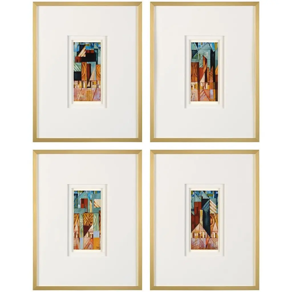 Cedric Michael Cox depiction of urban cityscape showcases his signature style. With its vivid colors and patterns the art is printed on watercolor paper and double matted and framed in a gold frame.