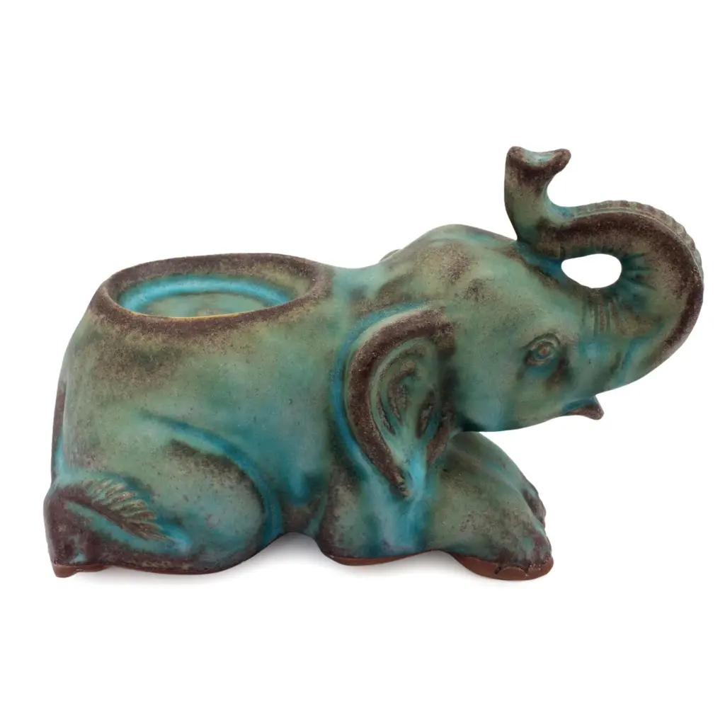 Kneeling, a proud elephant lifts his trunk in greeting. Duangkamol depicts the reclining pachyderm in a ceramic tea light holder in turquoise and brown, creating an antiqued illusion. A symbol of old Siam, the elephant is much respected in modern Thailand.