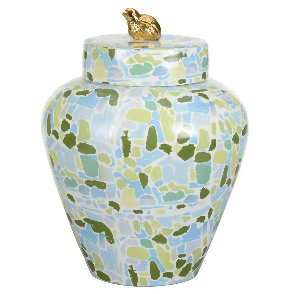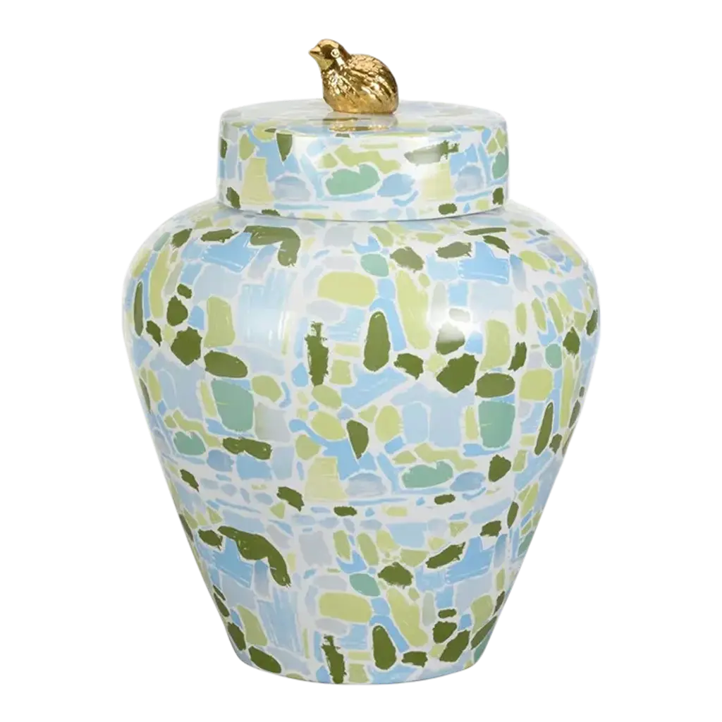 Celadon Tile is our modern square shaped tea caddy celebrating a mix of celadon and emerald green color all inspired by the cut velvet fabric from Old World Weavers which is part of the Scalamandre' family. The lift off top lid makes this jar into a statement vase when married with branches or botanicals. The faux velvet texture in the tile pattern is embraced as part of the design.