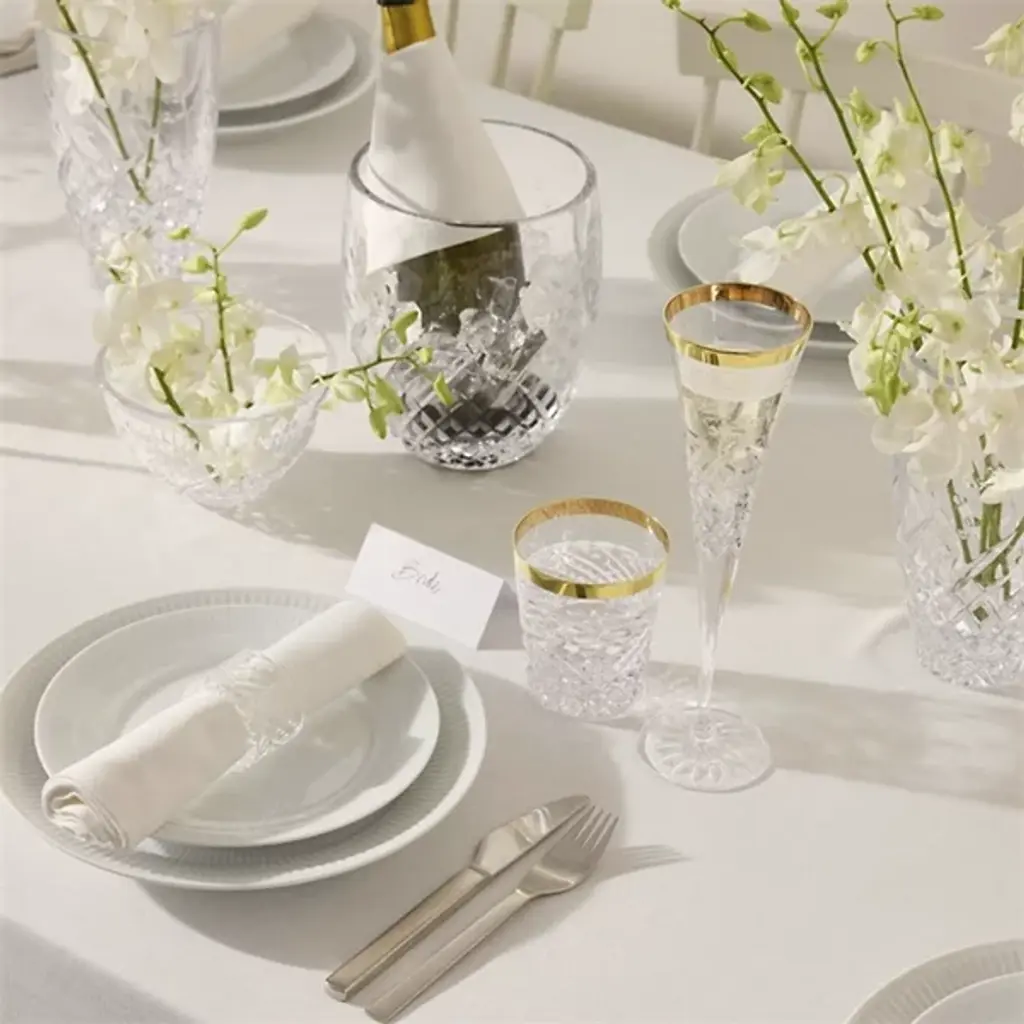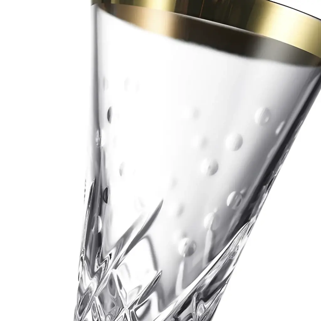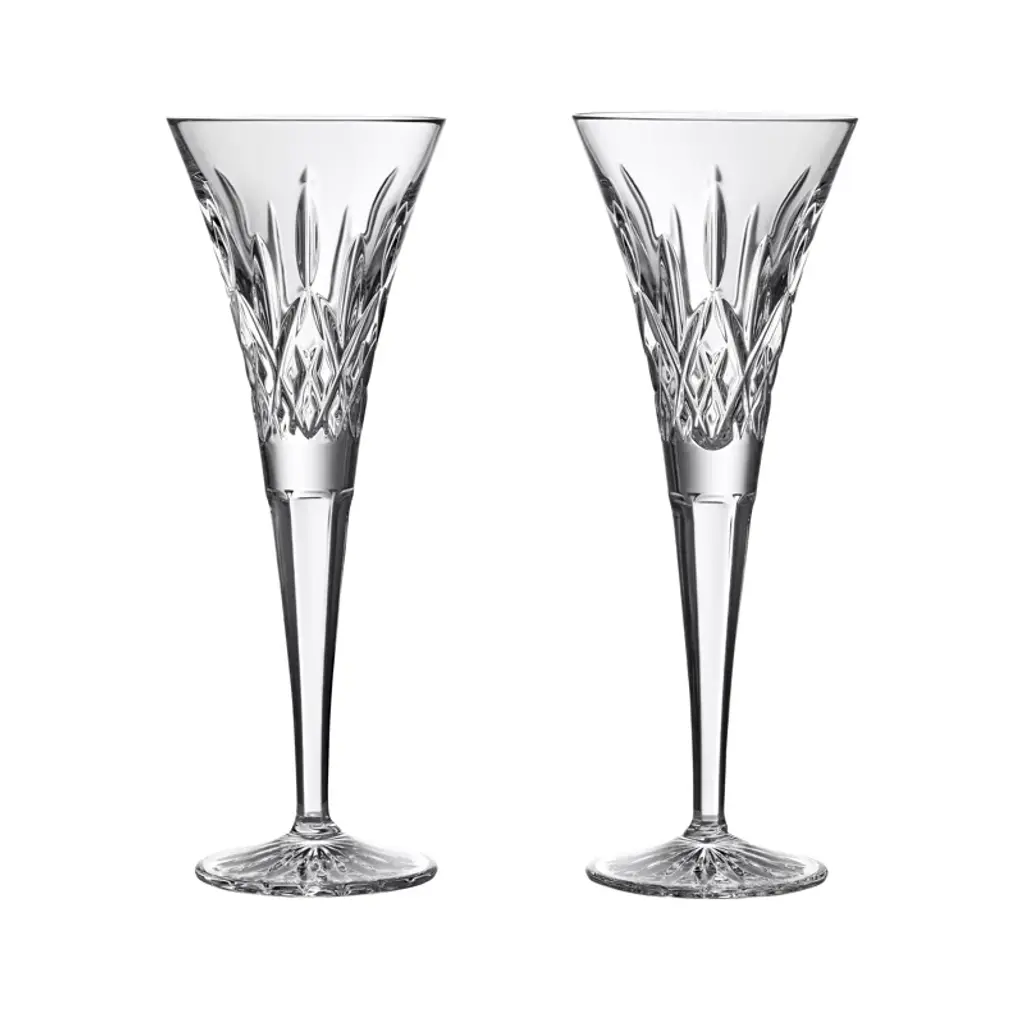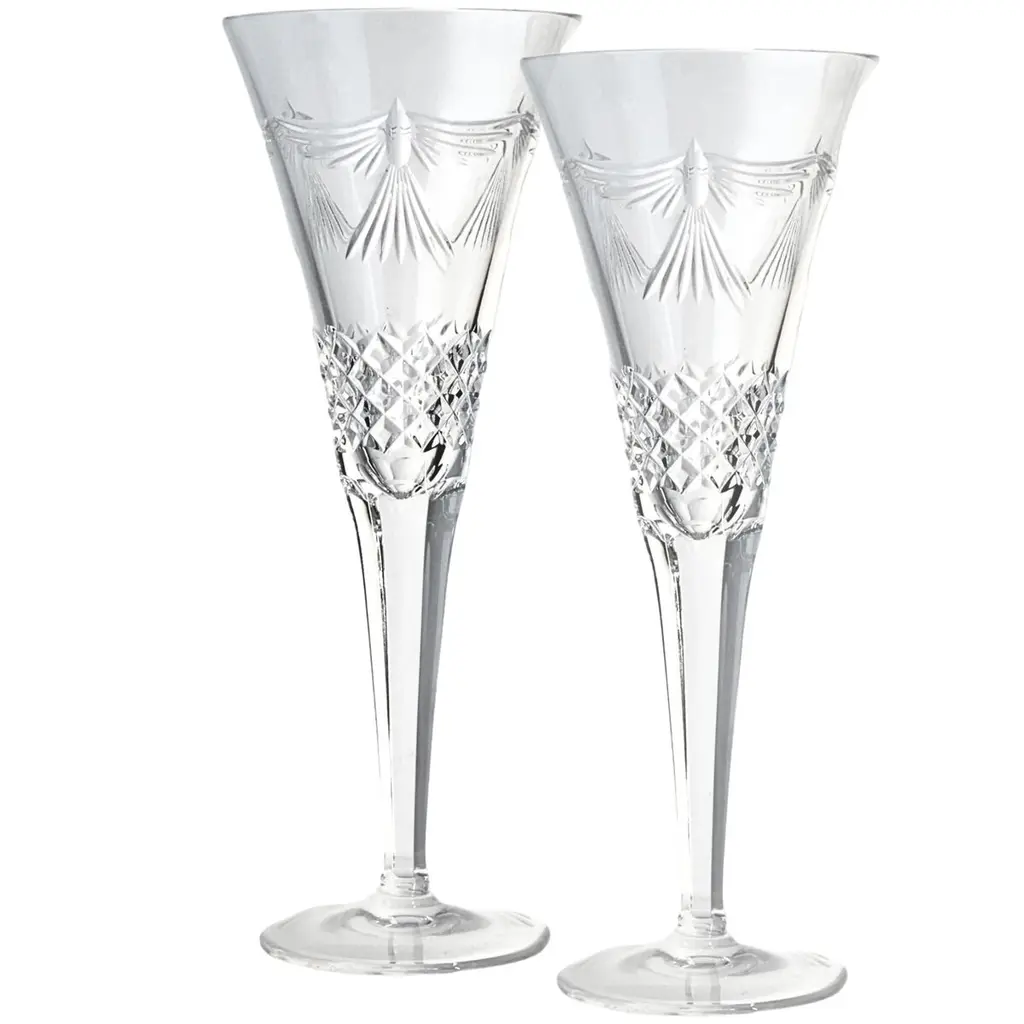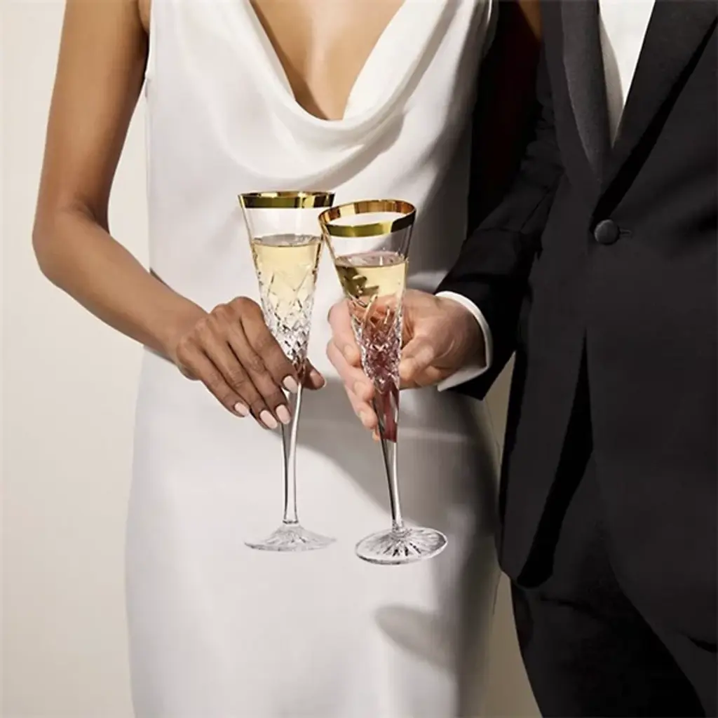 The Celebration Toasting Flute Glass, Set of 2 from Waterford presents refined crystal drinkware with decorative cut patterns. Designed for the Celebrations collection, these flutes draw inspiration directly from champagne bubbles rising through liquid. The pattern work incorporates both bubble motifs and diamond cuts, creating textural contrast along the lower portion of each glass. Hand-crafted construction ensures consistent weight distribution and comfortable handling. The matching pair features identical cut placement for uniform presentation. Lead-free crystal material provides clarity and durability for celebratory use.
