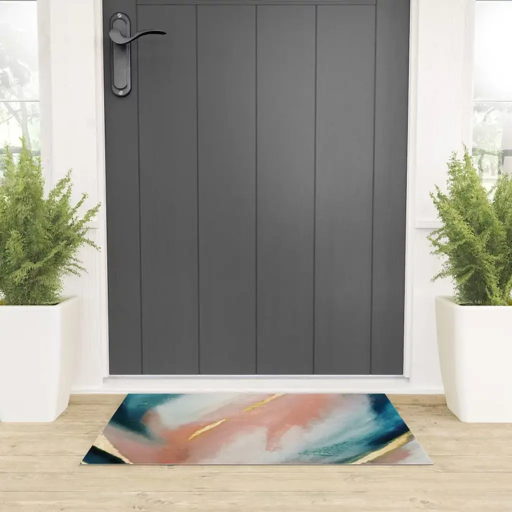 Celestial [3]: A Minimal Abstract Mixed-Media Piece In Pink, Blue, And Gold By Alyssa Hamilton Art Welcome Mat