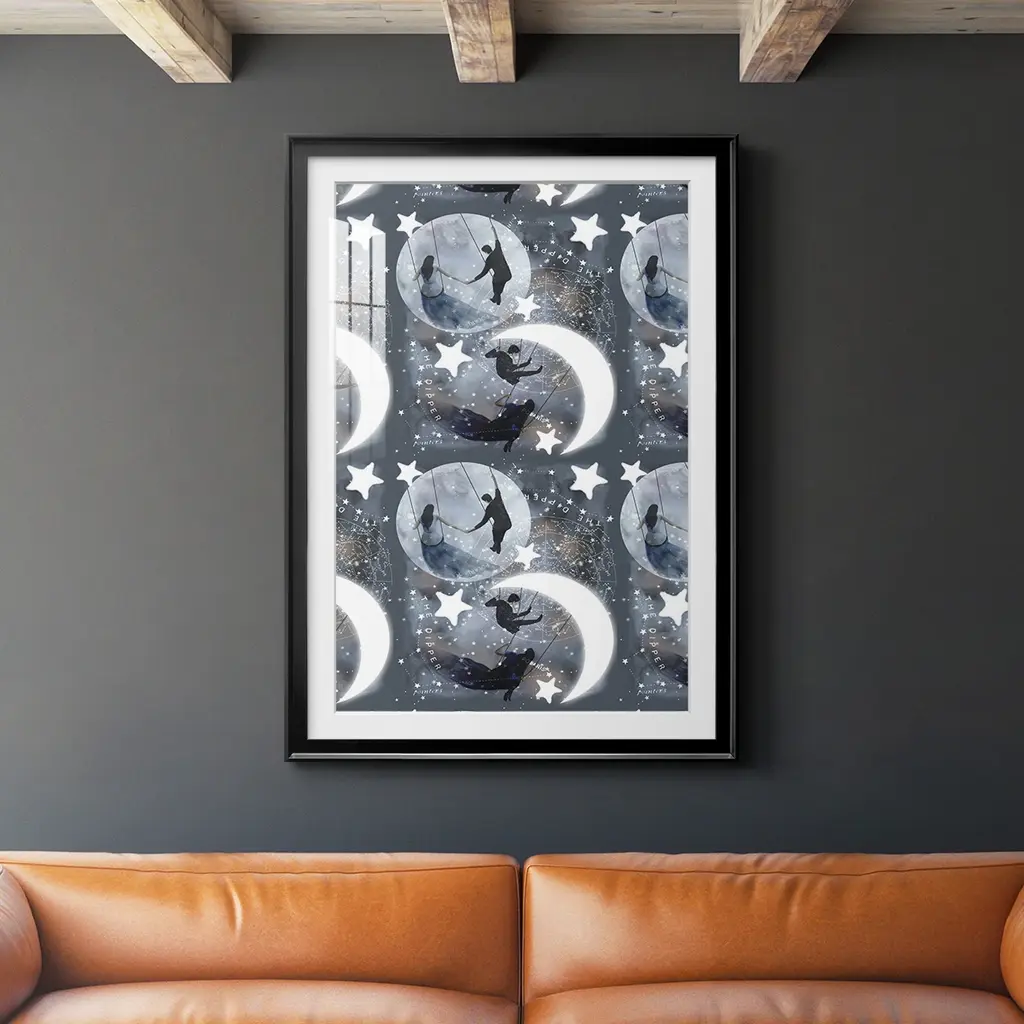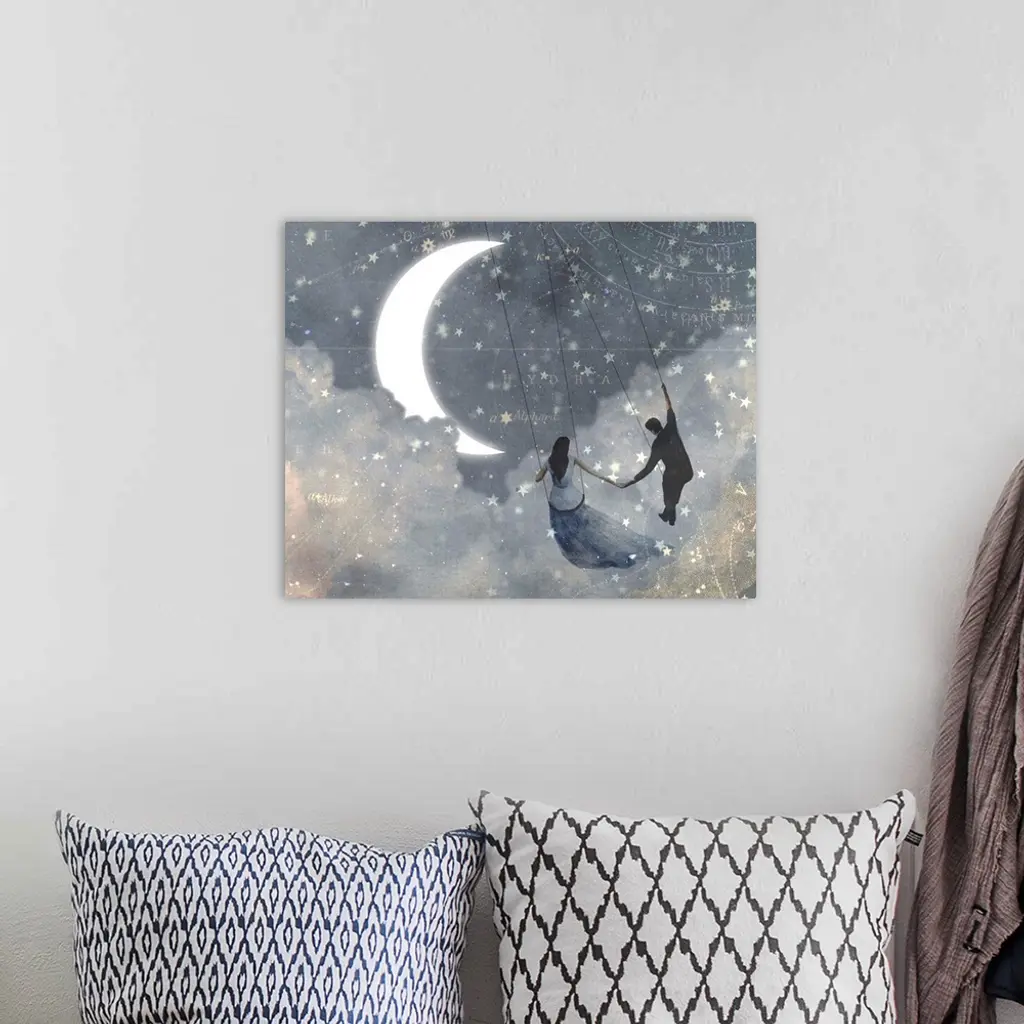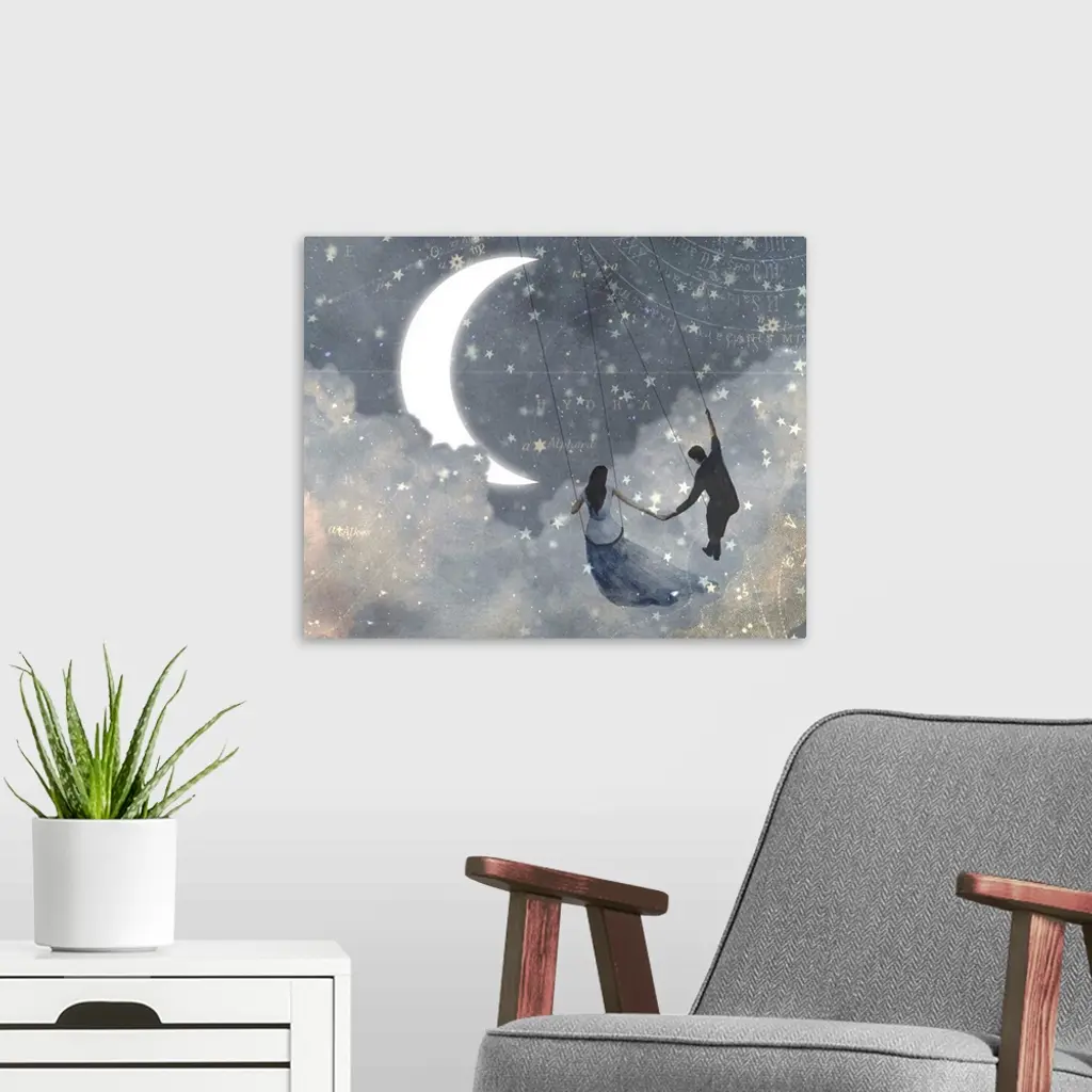 Whimsical design of a couple on swings, flying through the clouds on a starry night with a crescent moon.