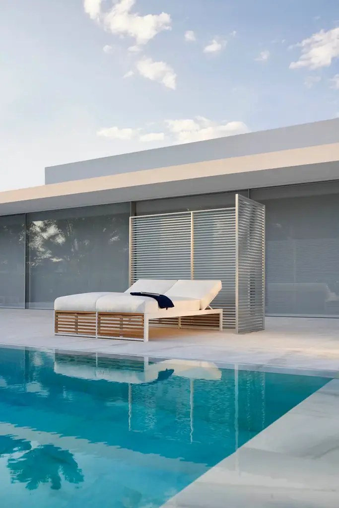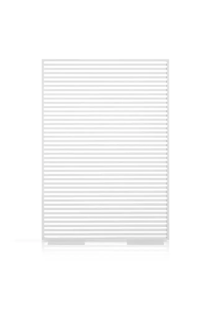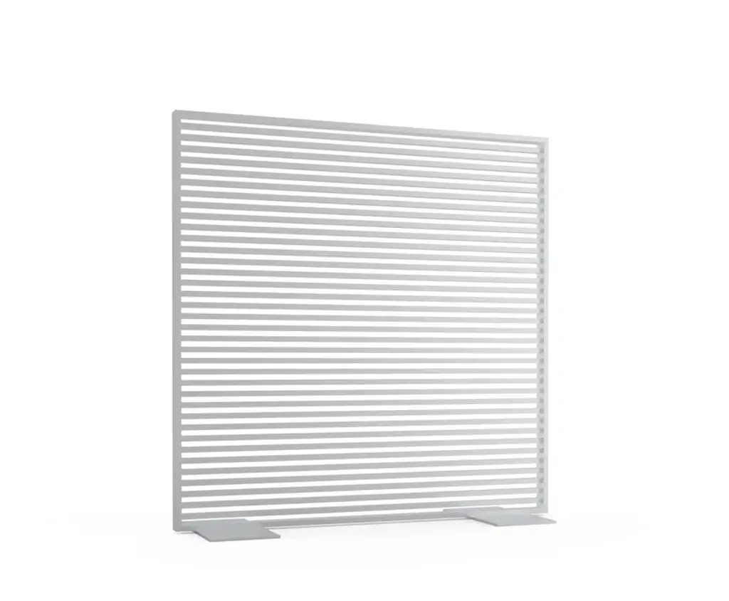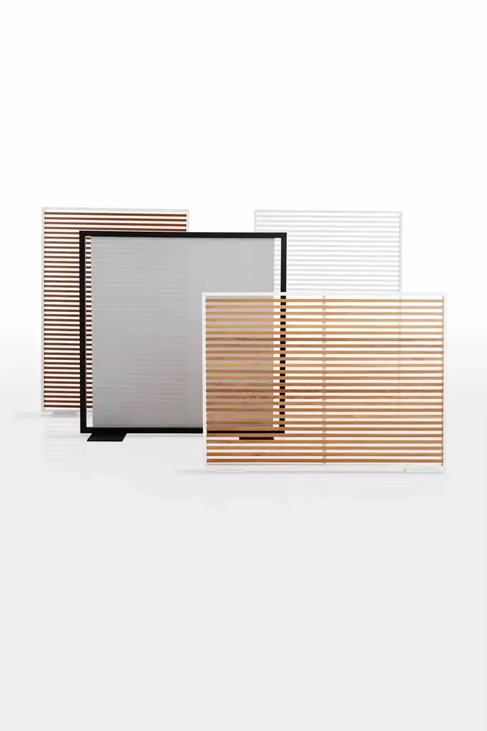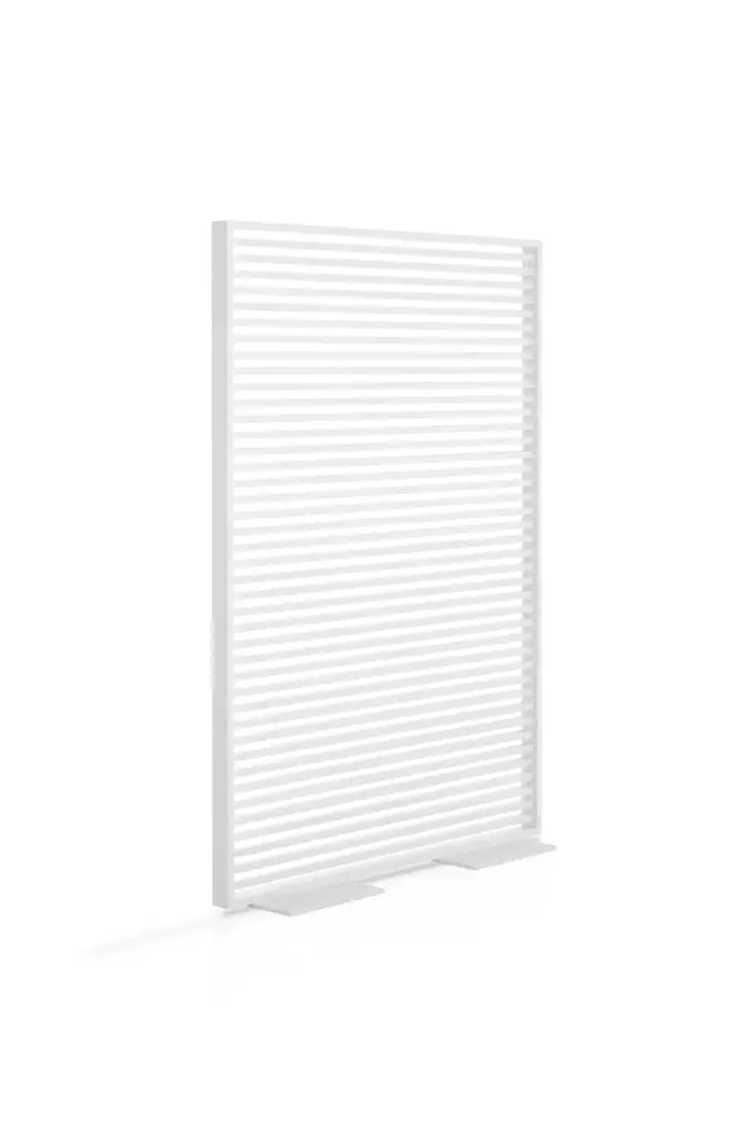 CELOSÍAS is a thermo lacquered aluminium room divider.Intimacy, marking out of environments and a subtle play with light and shadow: these are the powers concentrated in the new PARTITION WALLS, designed by José A Gandía-Blasco as a complement of independent use perfect for separate spaces or furniture compositions. Made in 4 available options: thermo-lacquered aluminium / thermo-lacquered aluminium and faux wood aluminium / thermo-lacquered aluminium and teak / thermo-lacquered aluminium and Soltis fabric. Collections colour sample: white, agate grey, cement grey, bottle green, sand, bronze, beige red, orange brown, wine red, blue grey, grey blue, quartz grey, anthracite, grey brown and black. Faux wood aluminium: roble golden and teak. Soltis fabric colours: white, silver, light grey, sand, bronze, terracotta, burgundy and anthracite.