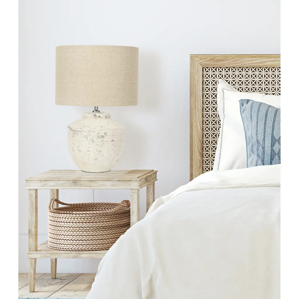 Add some style and personality to the space with this distressed white cement table lamp that showcases a distressed white cement base, topped with a beige linen drum shade. This table lamp is a rustic and boho-inspired addition to the home décor, as it features a cement base that has a round shape and a distressed white finish that creates a vintage look. The beige linen drum shade creates a cozy and inviting light that complements the cement base. This table lamp is suitable for any room that needs some extra texture and charm, such as the living room, bedroom, office, or any other area. It can also be a great gift for anyone who loves rustic and boho design. This table lamp requires one 40-watt bulb (not included) and is equipped with an in-line switch for easy on and off. It measures 13 inches round x 19 inches in height, and the cord length is 5 feet. Add this distressed white cement table lamp to the home and enjoy its beauty and functionality. Features: