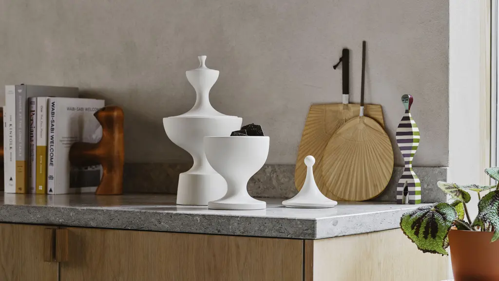 The hand-glazed Ceramic Containers (1952) derive from the original lathe-turned wooden objects by Alexander Girard. Their silhouettes are reminiscent of the traditional shapes of apothecary vessels, board game tokens or millinery blocks.