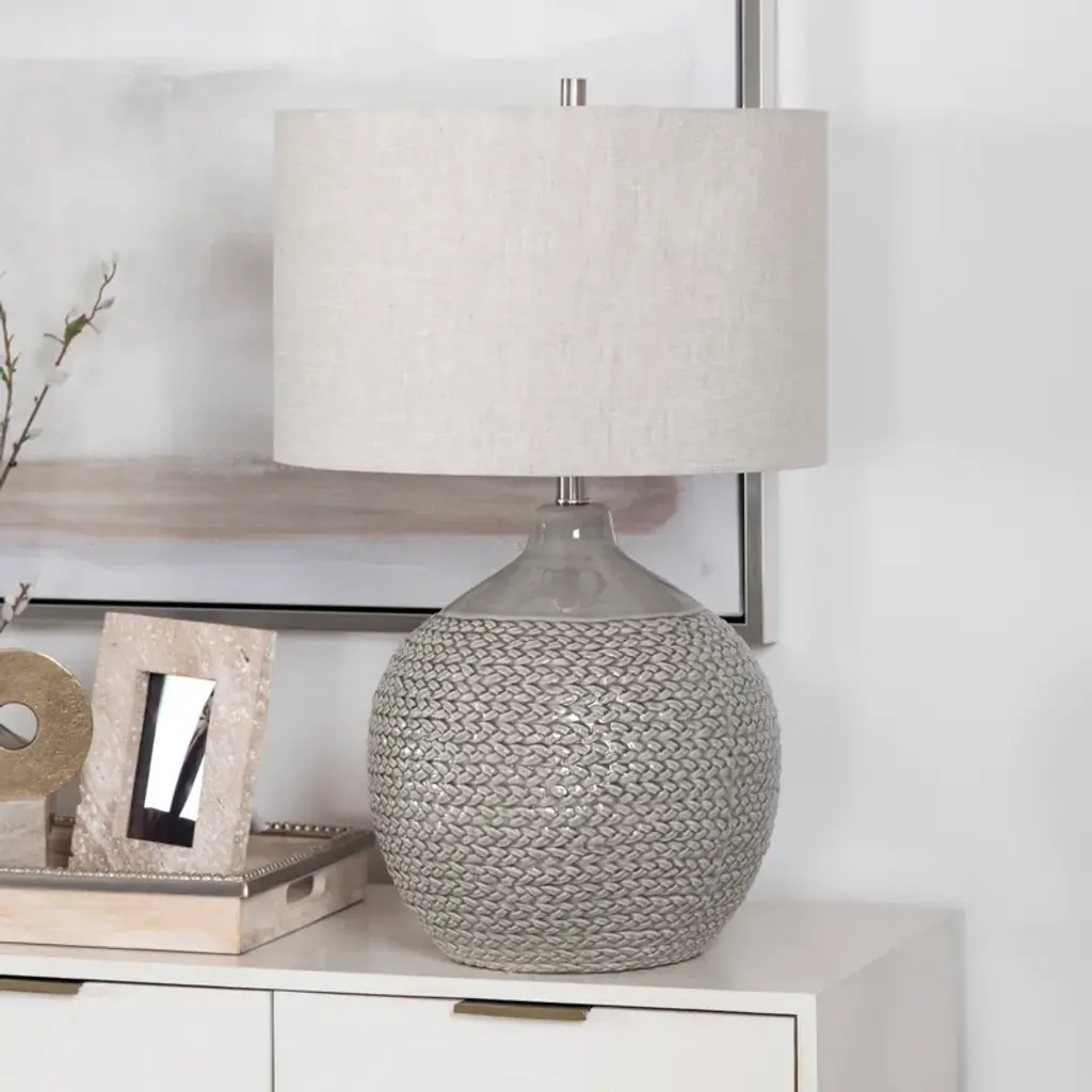 The Cairo Table Lamp blends modern texture with timeless form. Crafted from ceramic in a sleek gray finish, its rounded base features an intricate woven pattern that adds depth and visual interest. The 28-inch height is balanced by a crisp white linen drum shade, making it perfect for adding warm, inviting light to living rooms, bedrooms, or offices.
