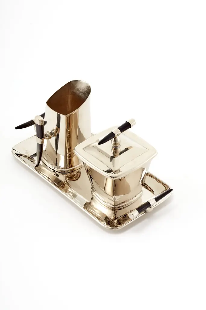Not everything is organic in northern Argentinean hills. As we cast our eyes on the landscapes, we also find geometry that makes us travel with our imagination. Mini square, rectangular, semi oval and round trays, sugar bowls and cream pitchers. The materials are goat horn, bone and alpaca.Our pieces are made by hand. One of a kind.Natural horn may vary in color.