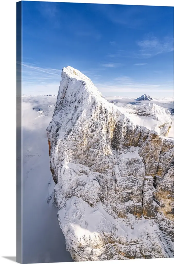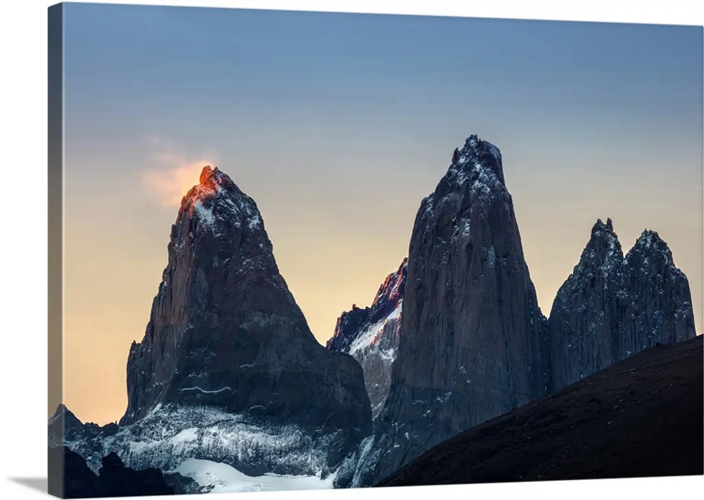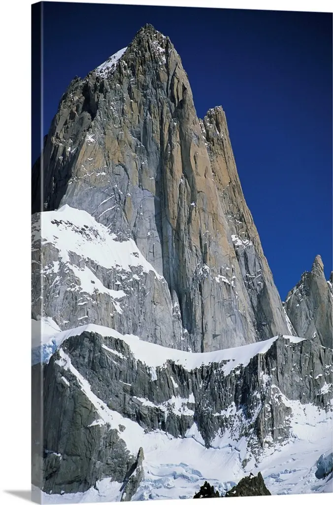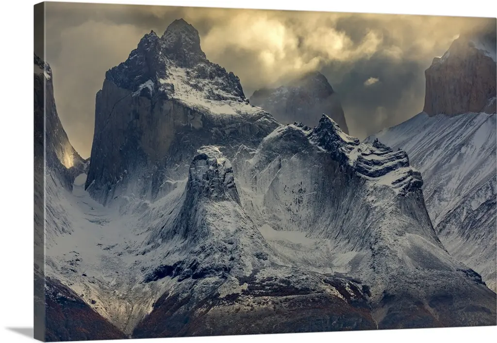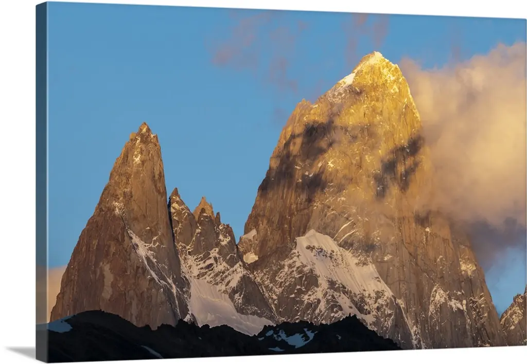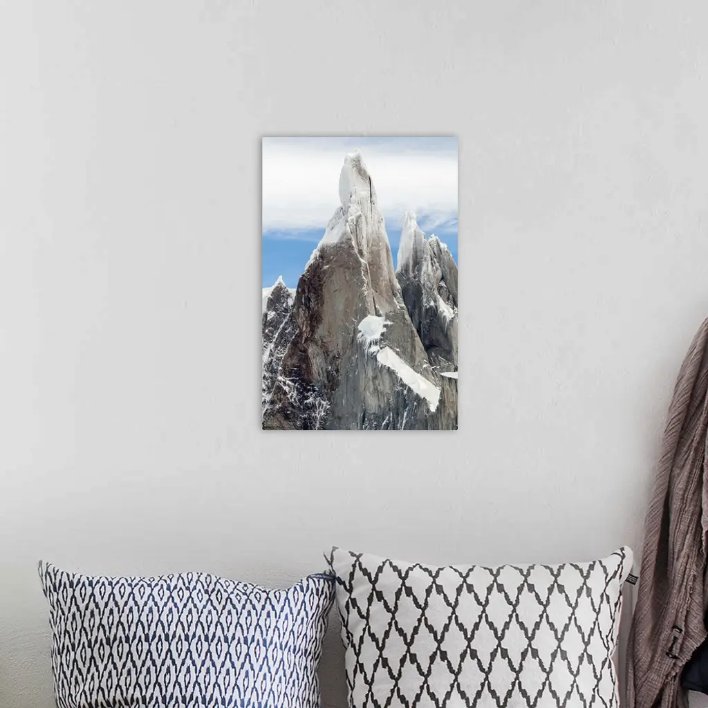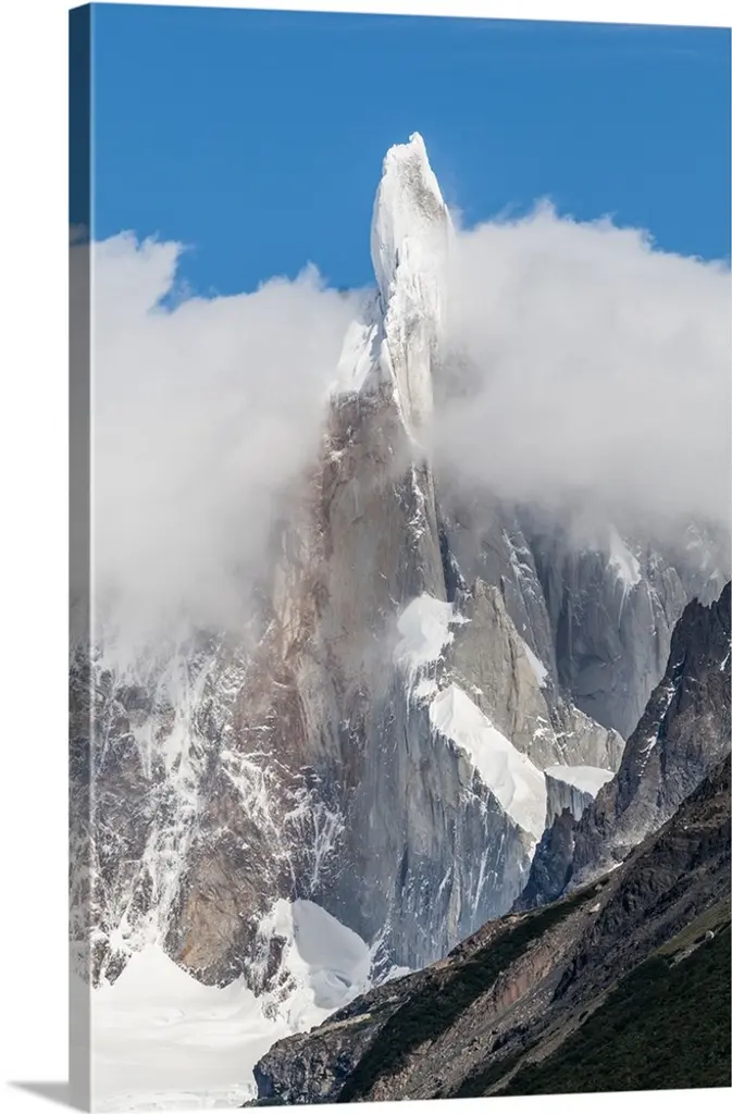 Photograph of snow-covered mountain spires in South America surrounded thick fluffy clouds.