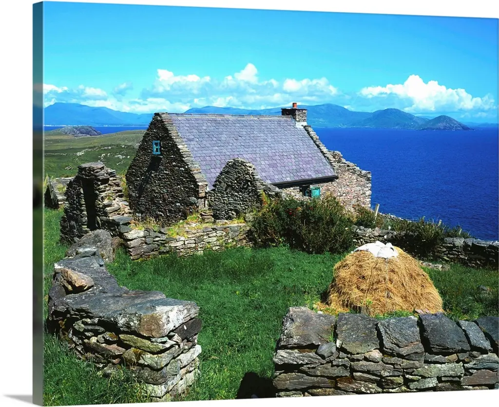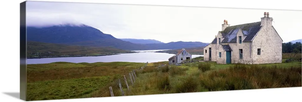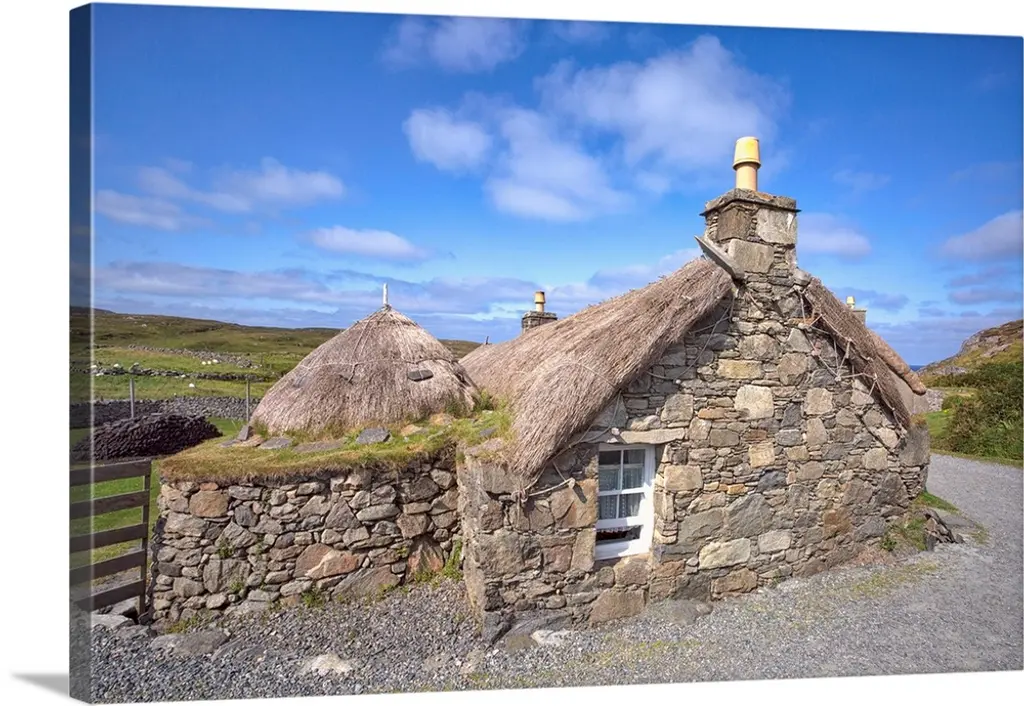 A rural house with a thatched roof and white stone walls.