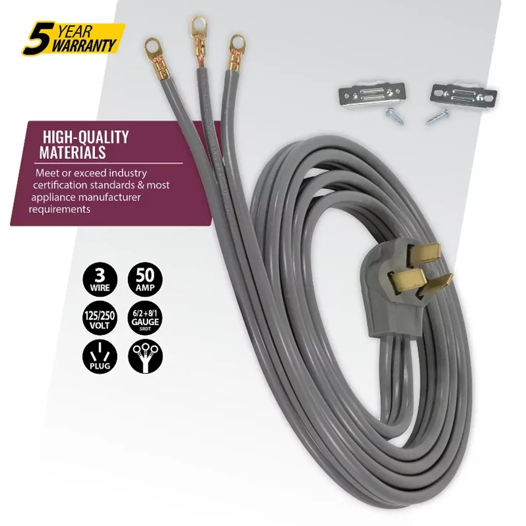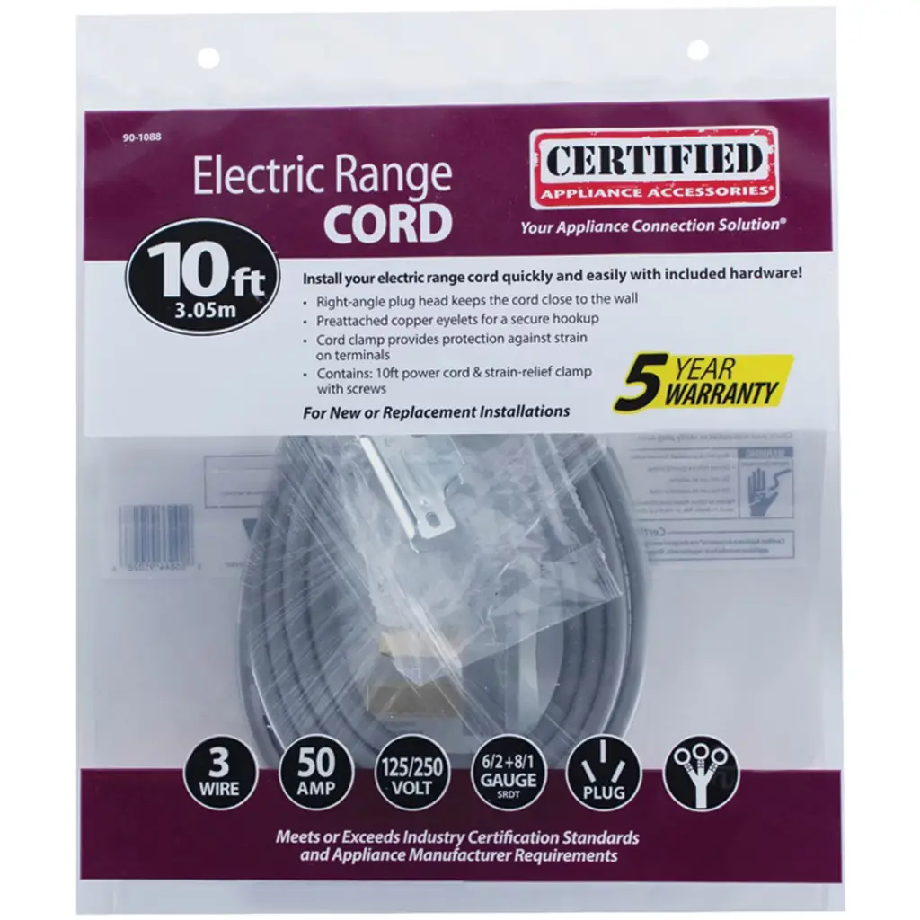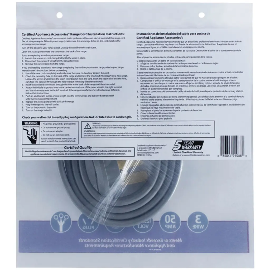 For years, licensed plumbers, electricians and appliance installers have relied on Certified Appliance Accessories for their power cords, hoses and connectors. Now you can too. Enjoy the convenience offered by this range cord from Certified Appliance Accessories. Its flexibility and durability ensure a reliable connection for your next home installation project. This high-quality range cord has been thoroughly tested and is backed by a 5-year limited warranty. Follow our illustrated, step-by-step directions included in the packaging. Always consult your appliance’s installation instructions. Check your appliance's manual for the correct specifications to ensure this is the right cord for you. Thank you for choosing Certified Appliance Accessories—Your Appliance Connection Solution._