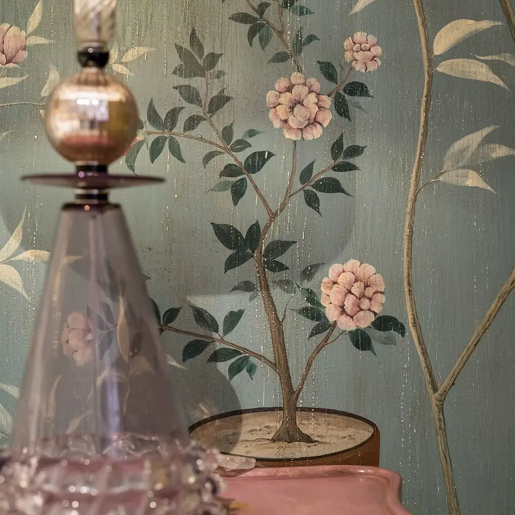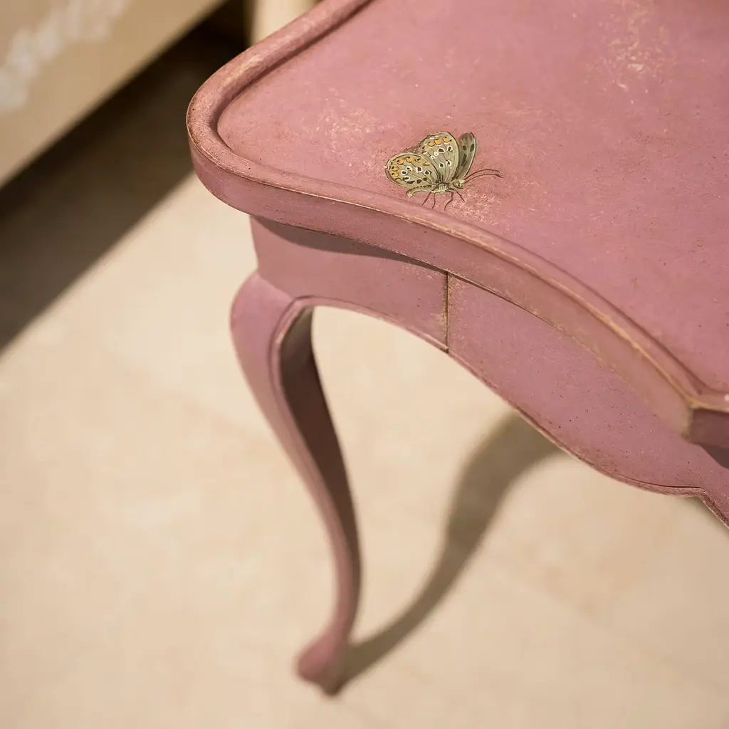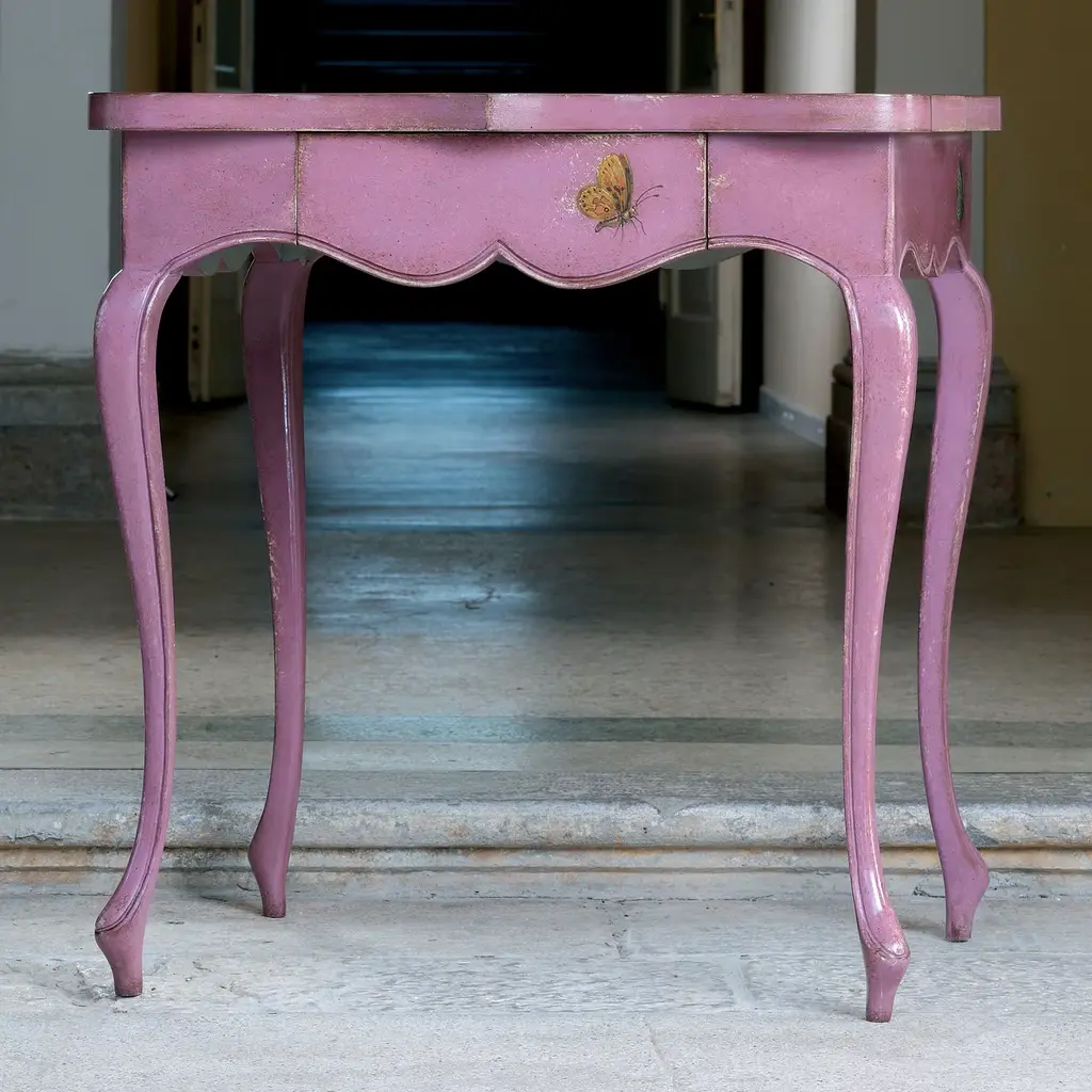 Named after one of the islands in the Venetian Lagoon, this console would be equally at home in a hallway, bedroom or living room as a dressing vanity, or even as a stylish serving table. Meant to rest against a wall, its elegant silhouette features a top with a curved frame and four saber legs that bend inward in a slightly concave shape before jutting out to a slightly tapered, raised foot. The single front drawer is graced with a decorative butterfly that complements the exquisite mauve color of the piece. This table can be customized in size and color at customers' request.