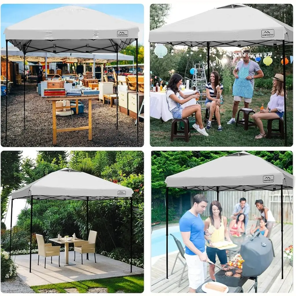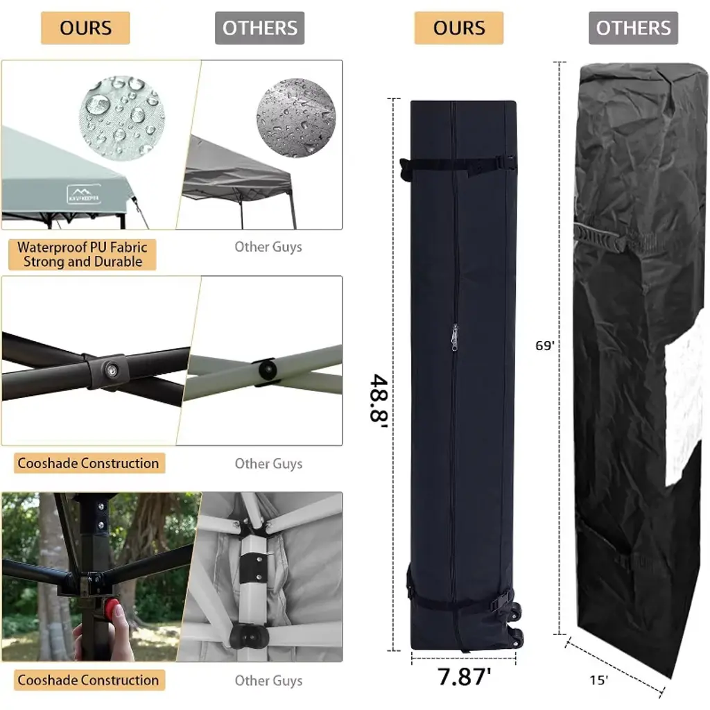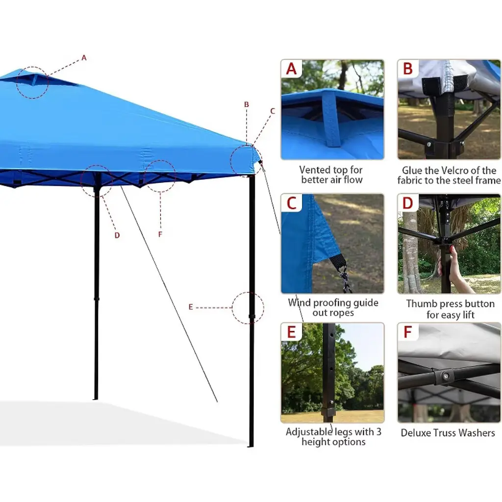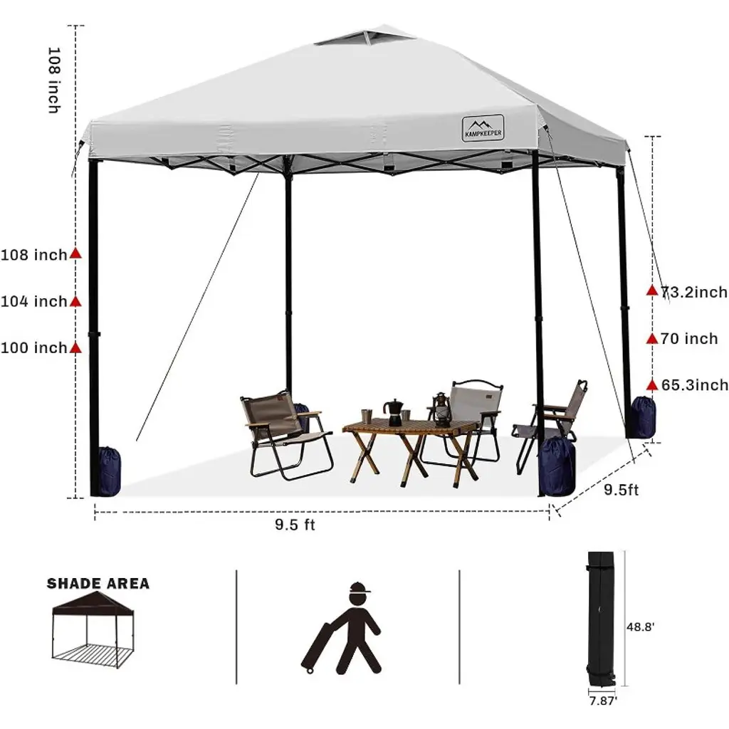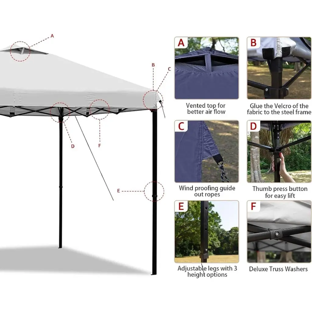 This premium gazebo is made from 150 Denier Silver Coated Oxford Fabric, offering UV resistance and waterproof protection, with air vents for enhanced ventilation. The sturdy, corrosion-resistant steel frame is powder-coated to prevent rust, while plastic connectors provide flexibility. It features a one-piece frame for easy setup without tools and includes height adjustment options. For added convenience, the gazebo comes with a wheeled carry bag (48.2" x 10.6" x 8.6") for easy portability and storage.