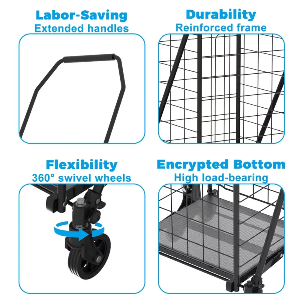 This jumbo foldable shopping cart is built with a reinforced wire mesh bottom and strong steel frame, offering a load capacity of up to 200 lbs. Designed with oversized rear rubber wheels and upgraded 360° swiveling front wheels, it provides smooth and effortless maneuverability around corners and through tight spaces. Easy to assemble in just minutes, the cart folds flat for convenient storage and transport, making it ideal for groceries, household items, and heavy loads.