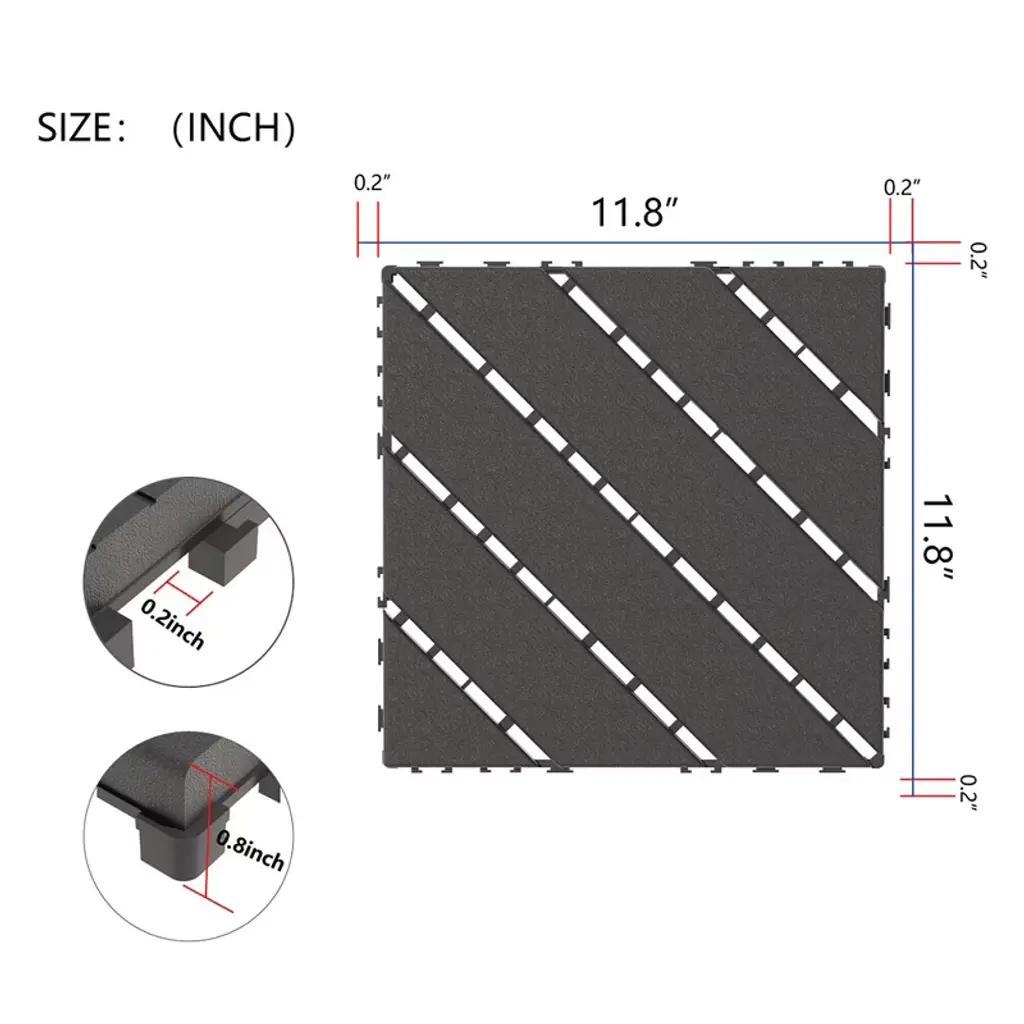 These interlocking tiles are crafted from durable PP material, designed for versatile indoor and outdoor use. Each tile measures 12" x 12" x 0.8", offering a slim yet sturdy profile that fits seamlessly under doors and adapts to spaces like balconies, bathrooms, patios, and courtyards. With a strong load-bearing capacity and tool-free interlocking installation, they provide a reliable, low-maintenance flooring solution resistant to moisture and wear.