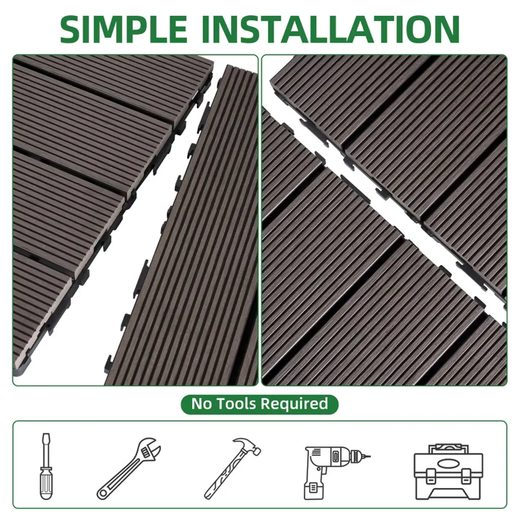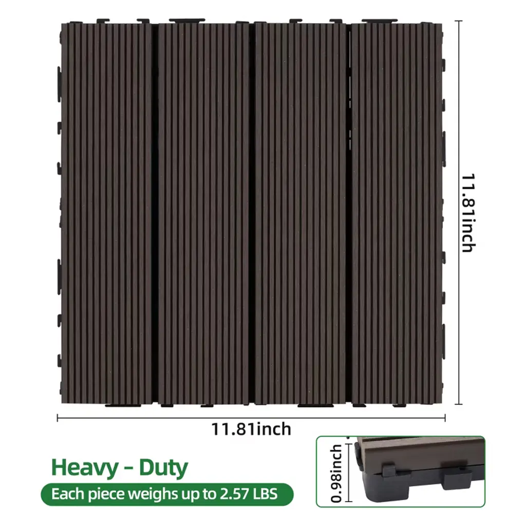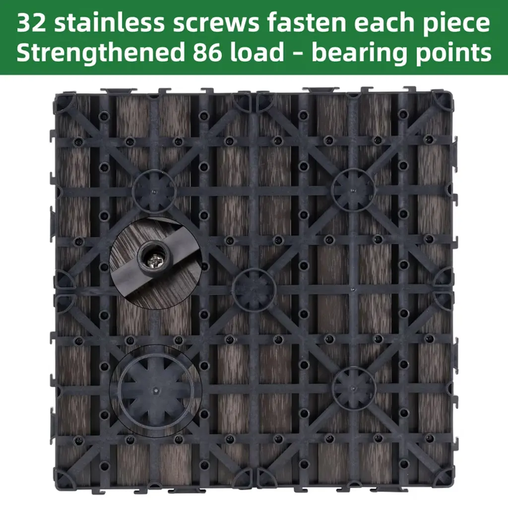 These 11.8" x 11.8" interlocking deck tiles are made from premium wood-plastic composite with a durable PE base for drainage and stability. Each tile is secured with 32 stainless screws, supporting up to 700 lbs while offering excellent water, slip, and UV resistance. Eco-friendly and FSC/GRS certified, these tiles are perfect for both indoor and outdoor use. With a simple interlocking design, installation is quick and tool-free, making them ideal for patios, balconies, pools, and more.