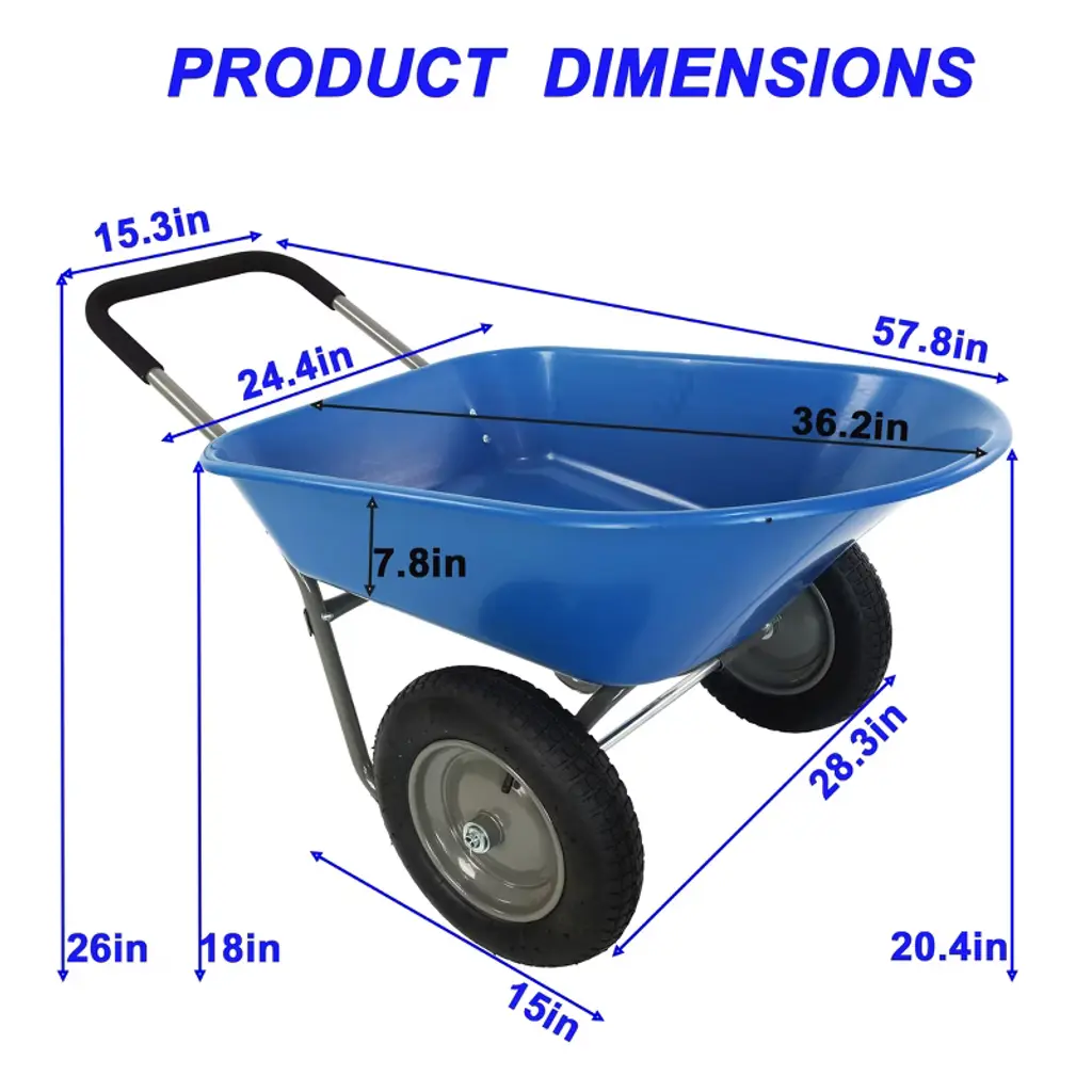 This is a lightweight, heavy-duty two-wheeled garden trolley designed for effortless gardening, landscaping, and hauling tasks. Featuring large 15-inch pneumatic wheels, a rust-proof polyethylene tray, and a loop handle for versatile control, it simplifies transporting soil, plants, tools, and waste. With a 5-cubic-foot capacity and 300 lb load limit, it combines durability with user-friendly functionality for homeowners and gardening enthusiasts.