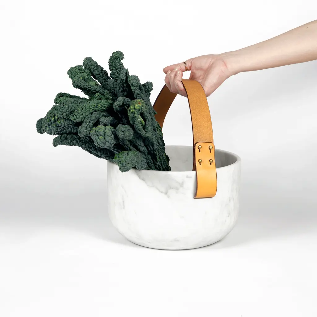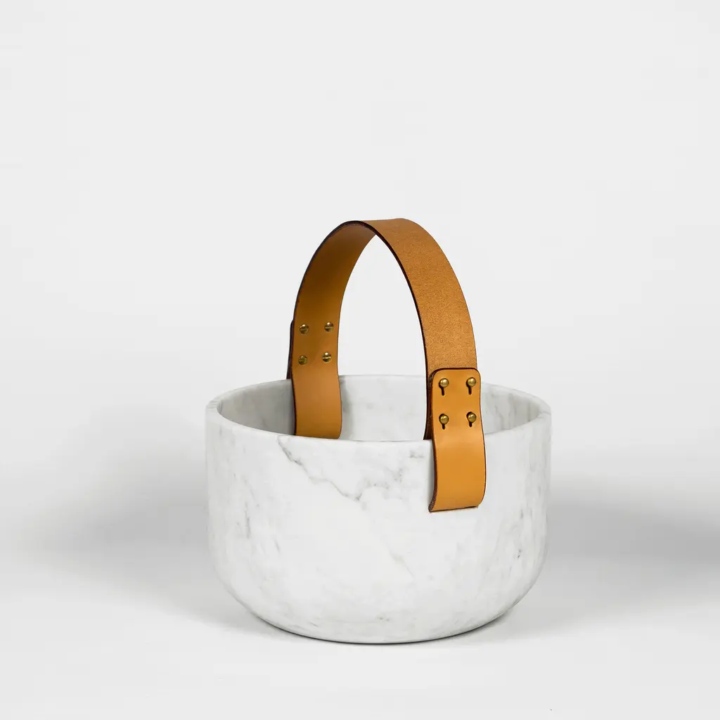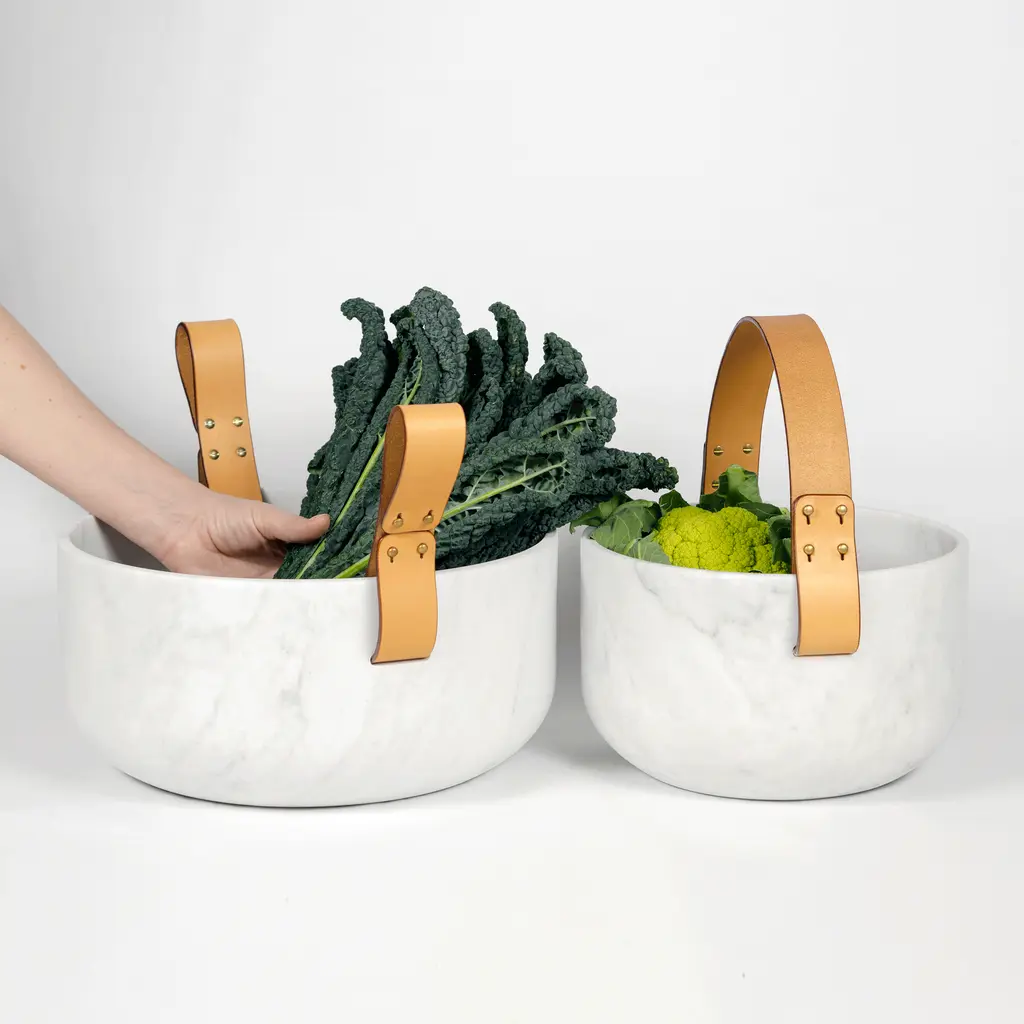 Rural life seen through the refined lens of contemporary Italian design, Cesta e Corba bring traditional baskets to mind. Designed by GumDesign, the bowls combine two complementing materials: white Carrara marble and leather. The CNC machined marble bowls boast eye-catching textures. Adding rustic warmth, the vegetable tanned leather handles have a rich brown color. Cesta is smaller while Corba is larger, but both have two side handles. The bowls can be used as fruit bowls, serving bowls, or as containers for items. Crafted with care, this set is skillfully made using a blend of traditional and modern techniques.