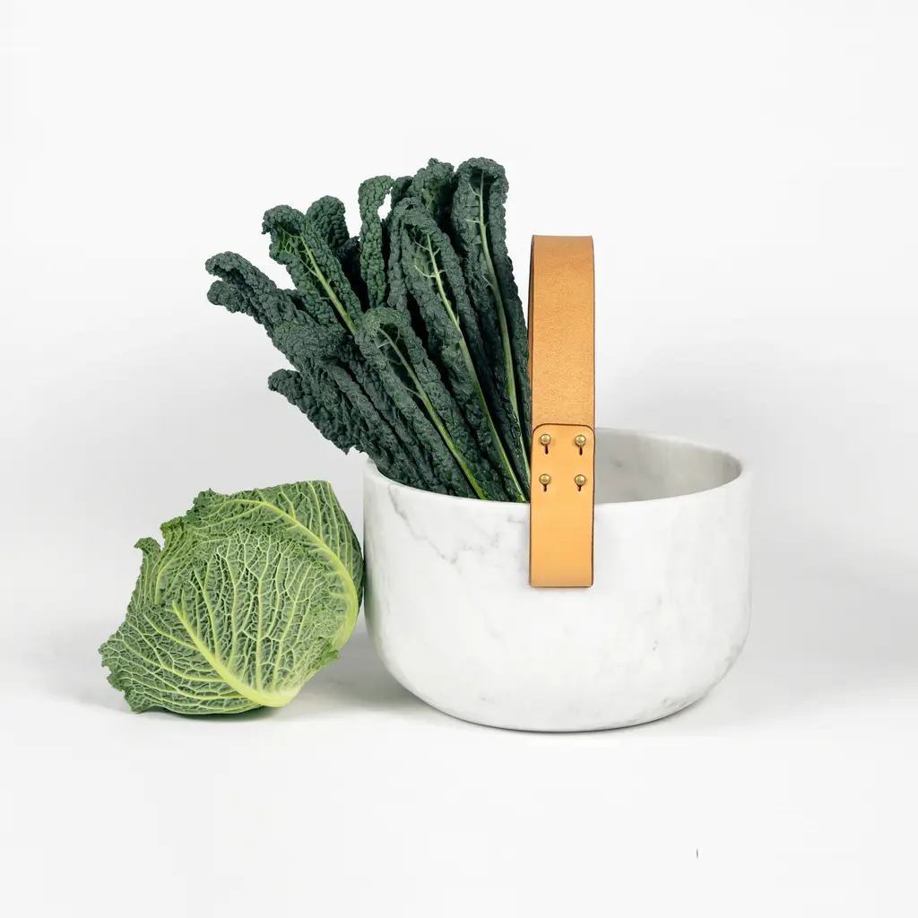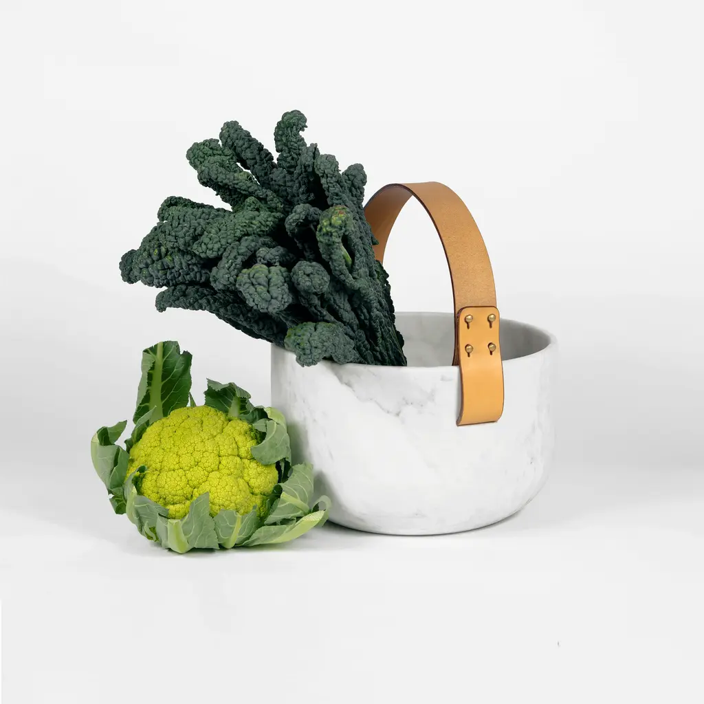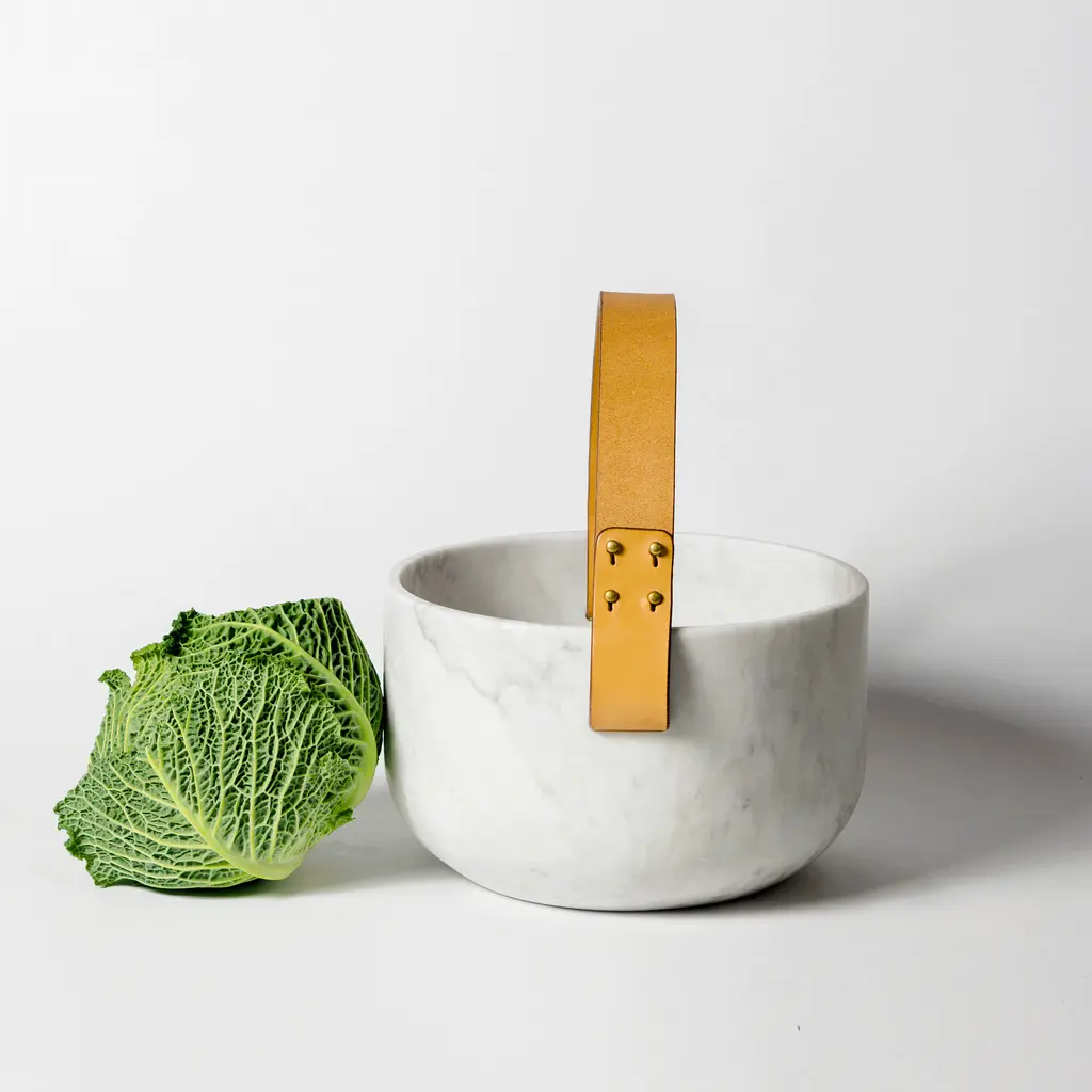 Rural life seen through the refined lens of contemporary Italian design, Cesta e Corba bring traditional baskets to mind. Designed by GumDesign, the bowls combine two complementing materials: white Carrara marble and leather. The CNC machined marble bowls boast eye-catching textures. Adding rustic warmth, the vegetable tanned leather handles have a rich brown color. Cesta is smaller while Corba is larger, but both have two side handles. The bowls can be used as fruit bowls, serving bowls, or as containers for items. Crafted with care, this set is skillfully made using a blend of traditional and modern techniques.