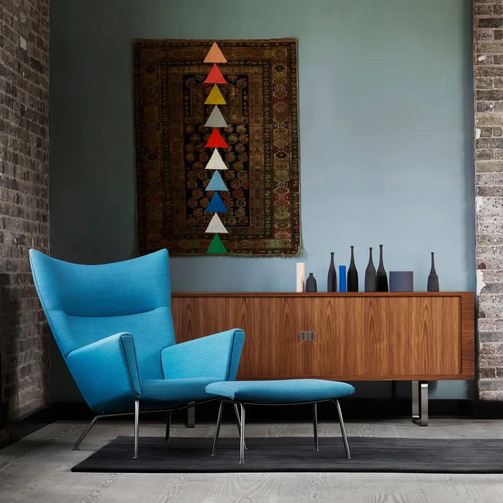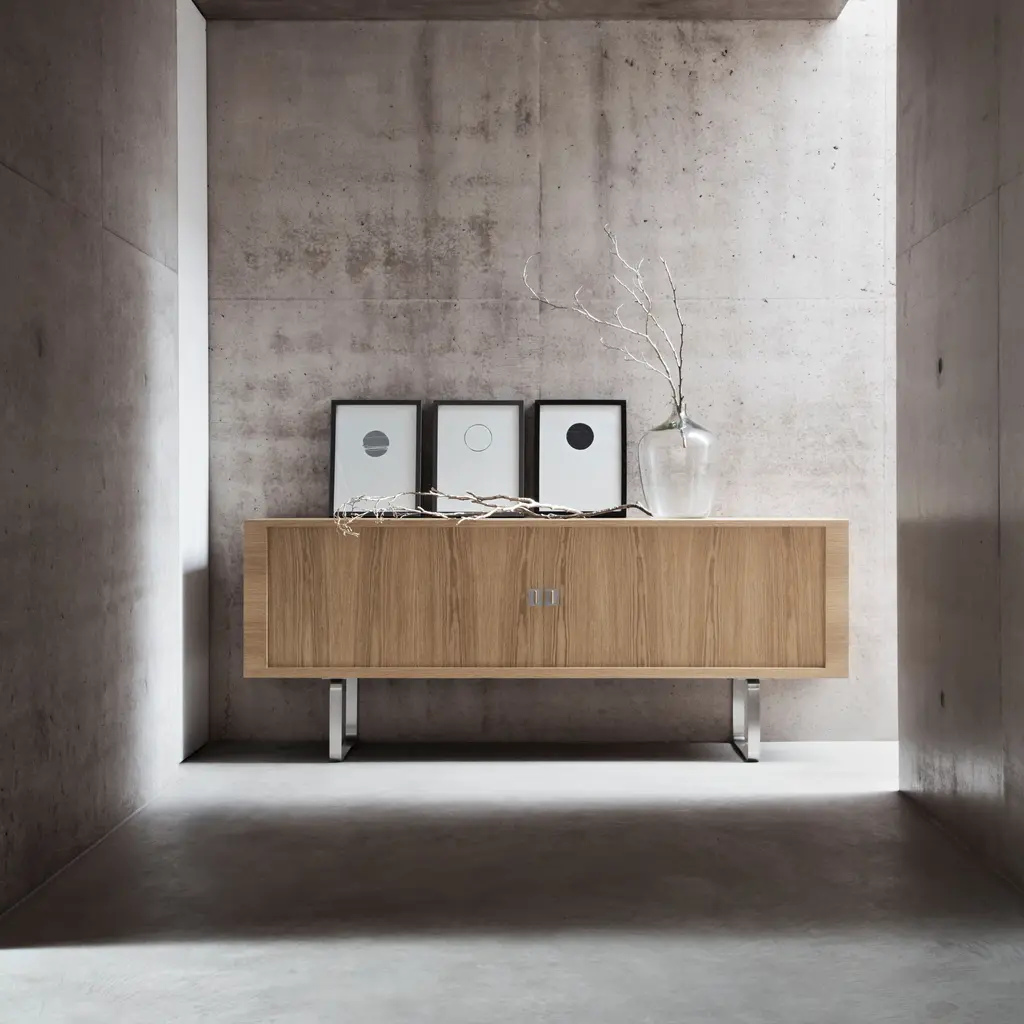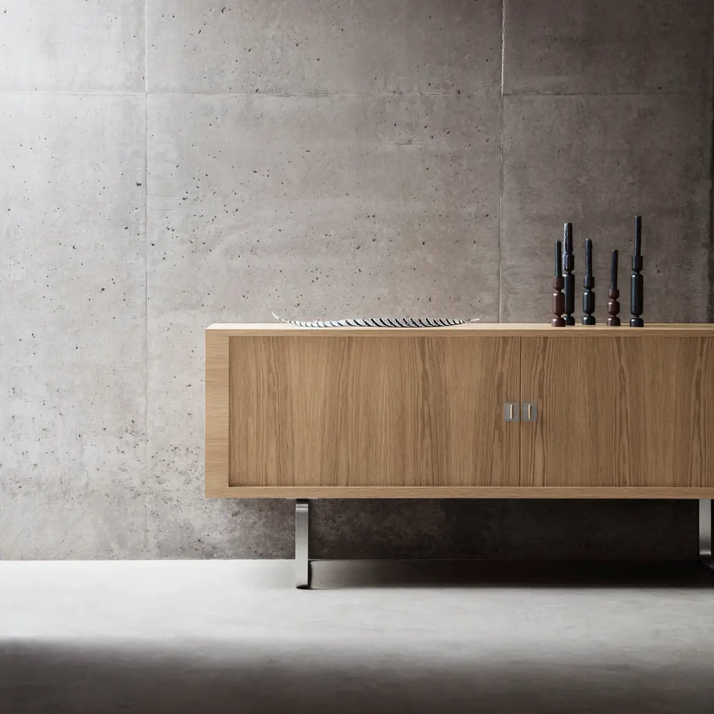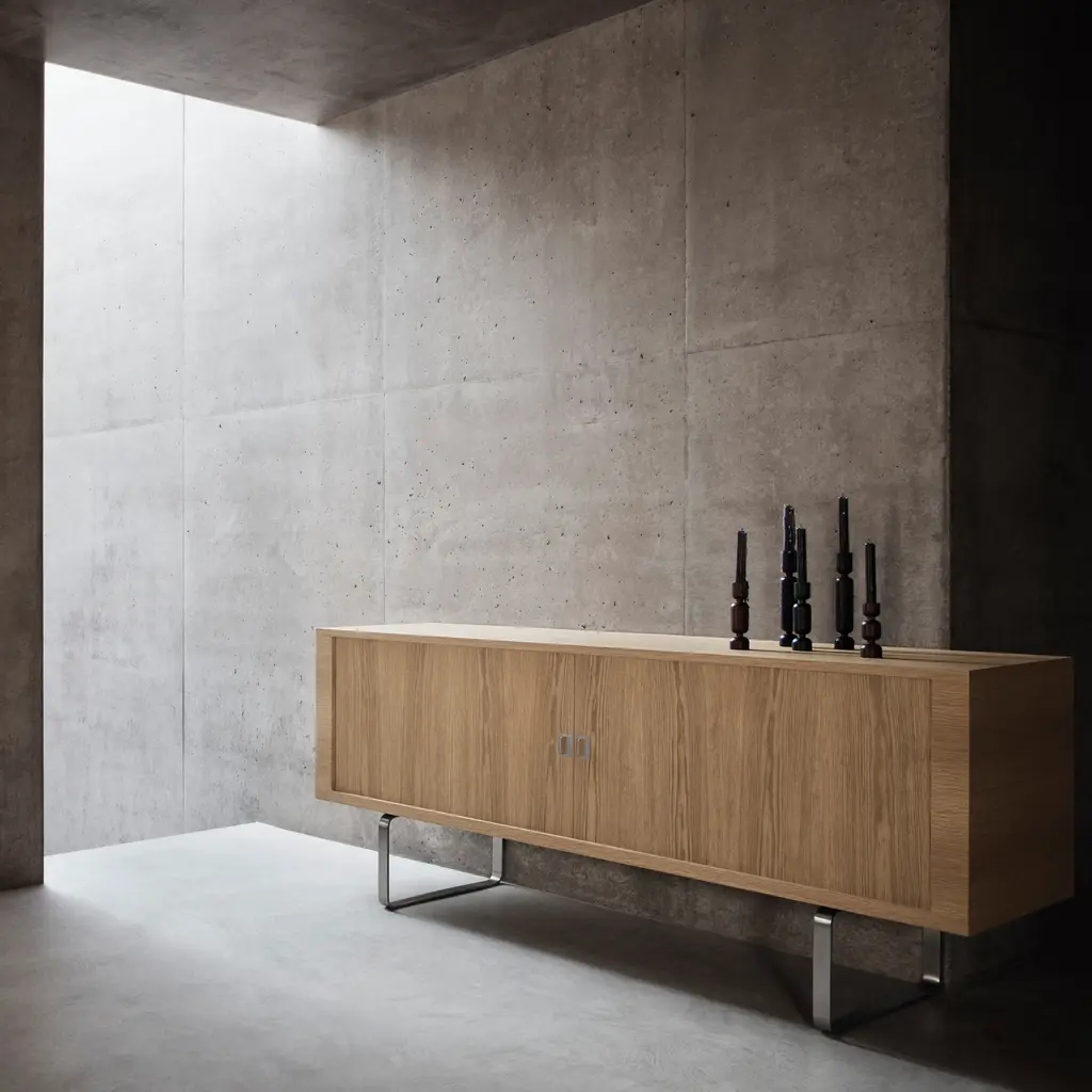Revived by Carl Hansen & Søn, Hans J. Wegner's spacious 1958 credenza sees plenty of storage options wrapped in his minimalist mastery. CH825 features an innovative design with roller shutter doors that disappear when opened and an interior with adjustable shelves and pull-out drawers that also can enable simple installation of additional drawers (inquire at A+R). Beautifully fashioned in either walnut and oak with interior shelves and pull-out drawers in oak, options also include round wooden legs in matching solid wood or a looping steel base.