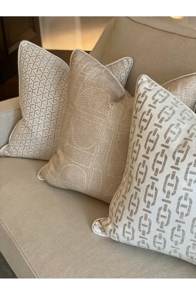 Designed in collaboration with Sophie Paterson this soft and plump cushion by Andrew Martin is constructed from our Burlington fabric and finished with neat ecru piping. This chain link design is woven into a smart cotton and linen blend fabric with a slight metallic sheen. An elegant and sophisticated piece that is perfect for layering with similar colors and prints or adding subtle patterns to a neutral scheme.
