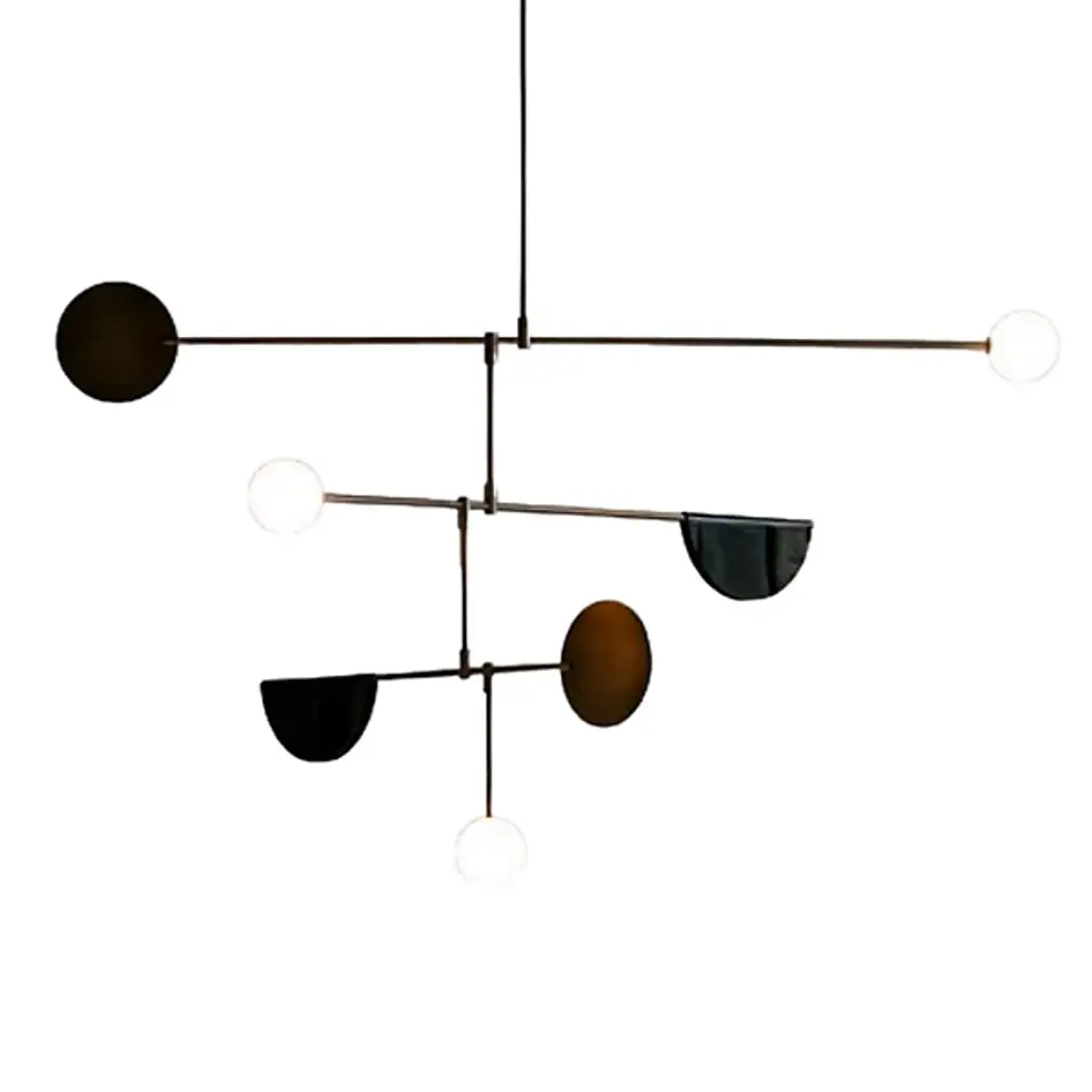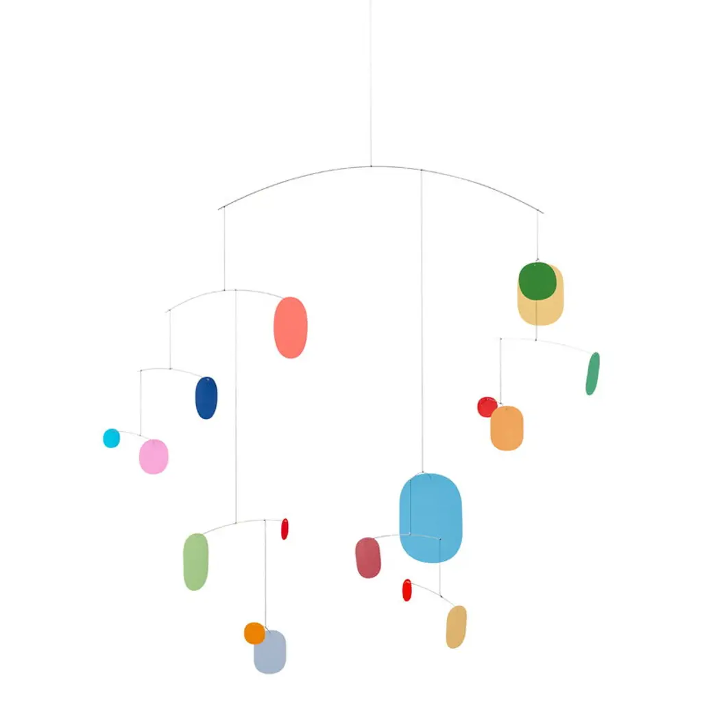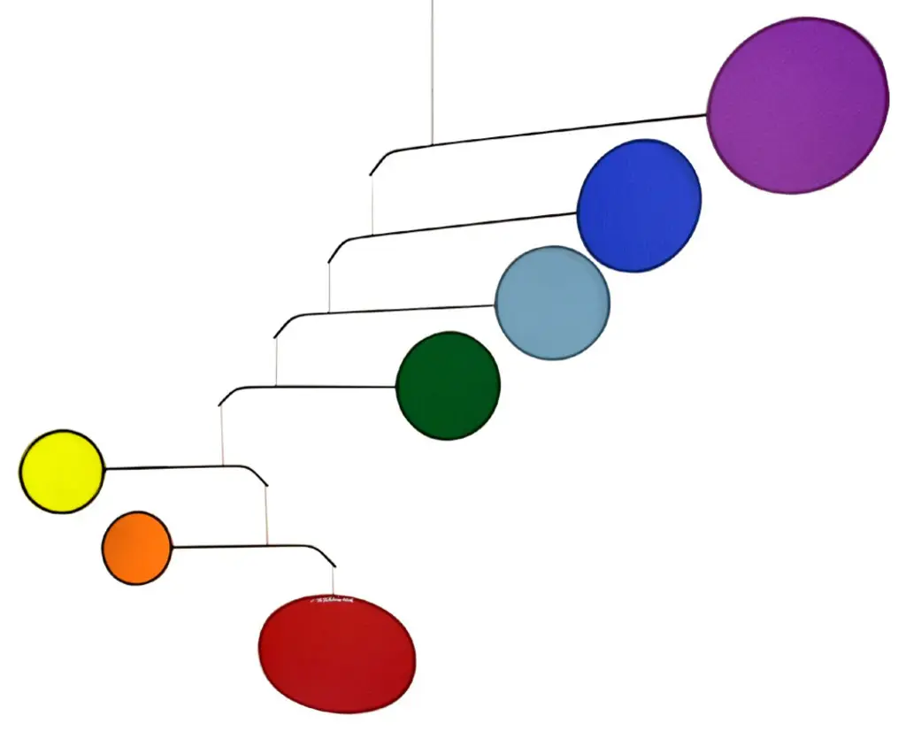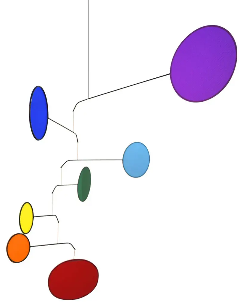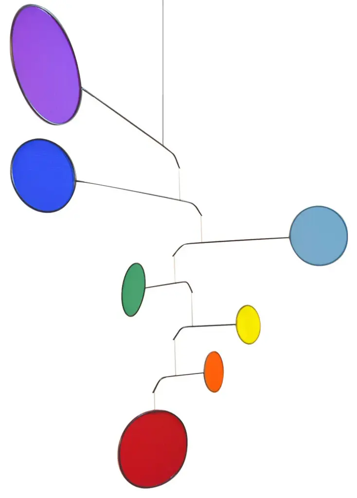 Look upwards and be mesmerized by a slow dance of color, a work of modern art, and mechanism of meditation. Inspired by Alexander Calder and the Mid-Century Modern Art Movement, contemporary mobiles provide an inviting accent in today''s interior spaces. The Chakra Mobile features 7 vertical fabric circles in red, orange, yellow, green, blue, indigo, and violet that visibly represent the 7 chakra energy centers. Aluminum arms swivel independently with small movements of air. Each kinetic mobile is completely artisan-crafted and balanced by hand in the USA and signed by the the artist. No assembly needed - arrives ready to hang. Indoor use only.Size notes: At its widest, the chakra colors mobile measures approx. 42". It is recommended to hang at least 24" from the closest wall to allow the mobile to properly move unobstructed. Measures approx. 26" high from top arm to lowest point and includes a hanger of approx. 23". Red oval measures 9" x 5.75".