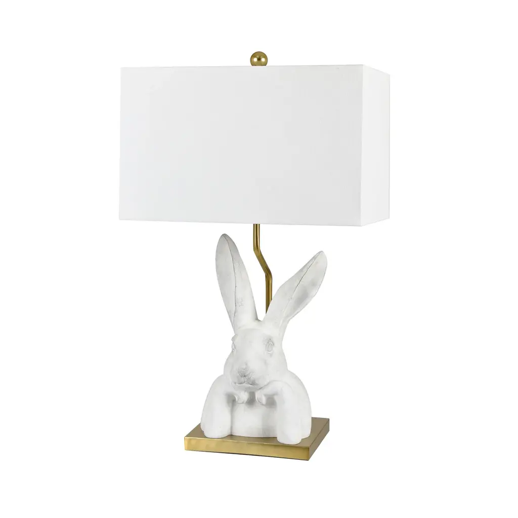 Hop into a world of whimsy with this delightful bunny-inspired table lamp. The resin body showcases a charming bunny bust, finished in a chalky white texture that adds rustic charm. Perched on a rectangular base with a glided gold finish, it’s the perfect blend of playful and elegant. Topped with a crisp white rectangle linen shade with a polyester interior and rolled edges, this lamp is both stylish and functional. Complete with a brass-tone turnkey socket and a 72-inch clear cord, it’s a hare above the rest