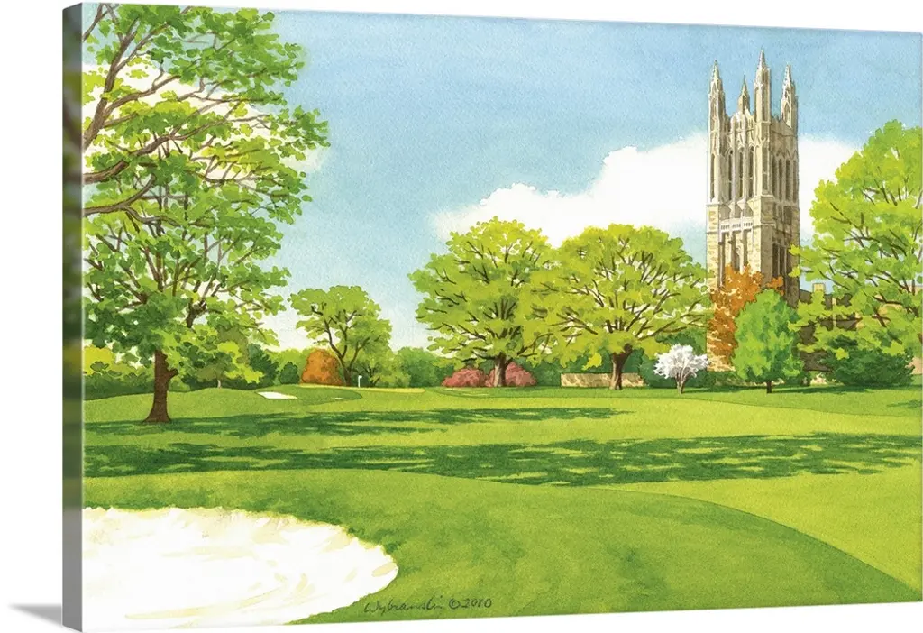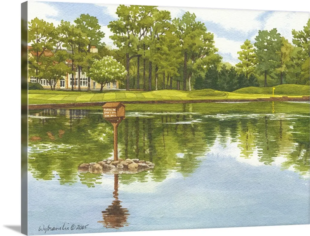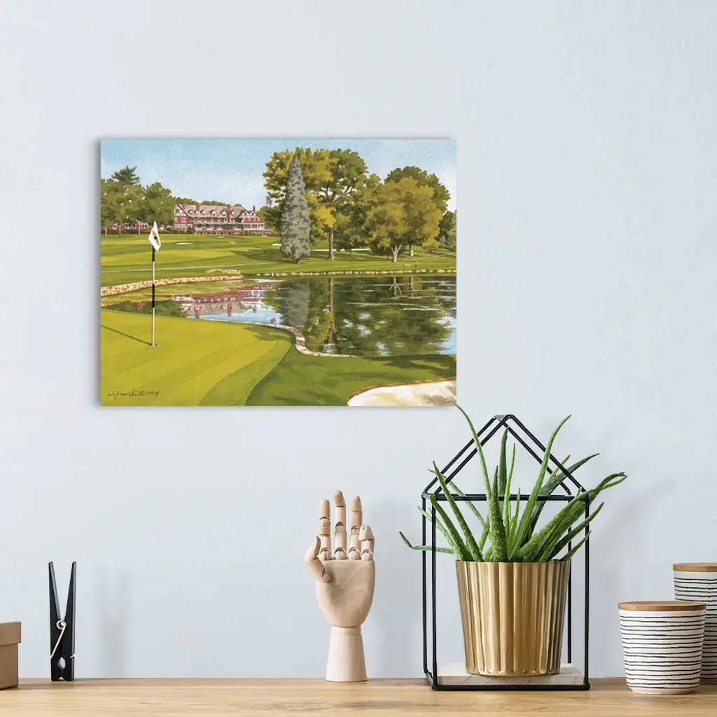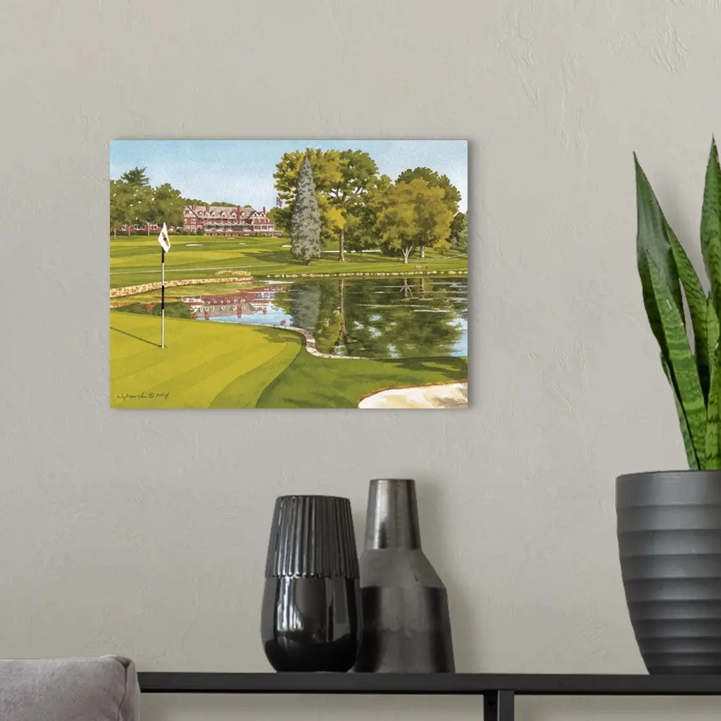 The 4th hole on an iconic New Jersey course with rolling fairways and a small green fronted by a stone wall and a pond.