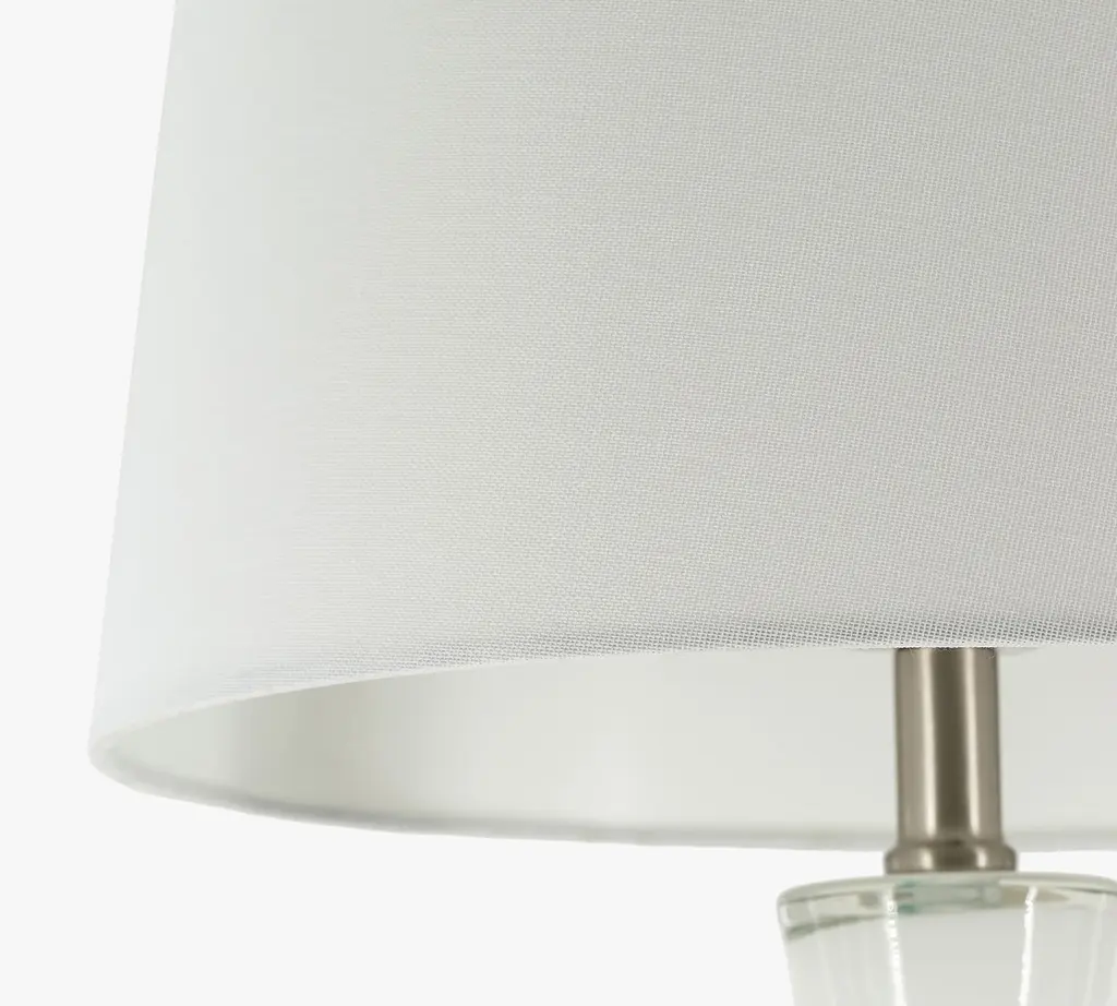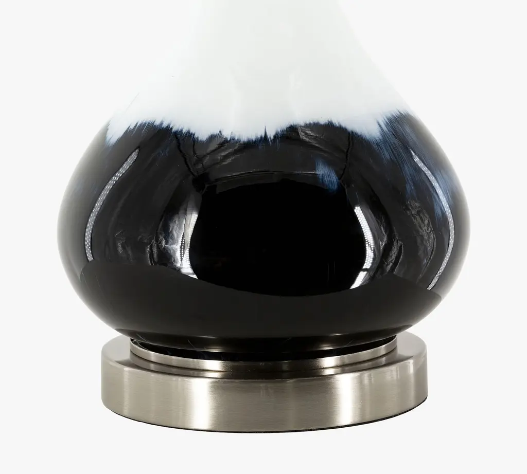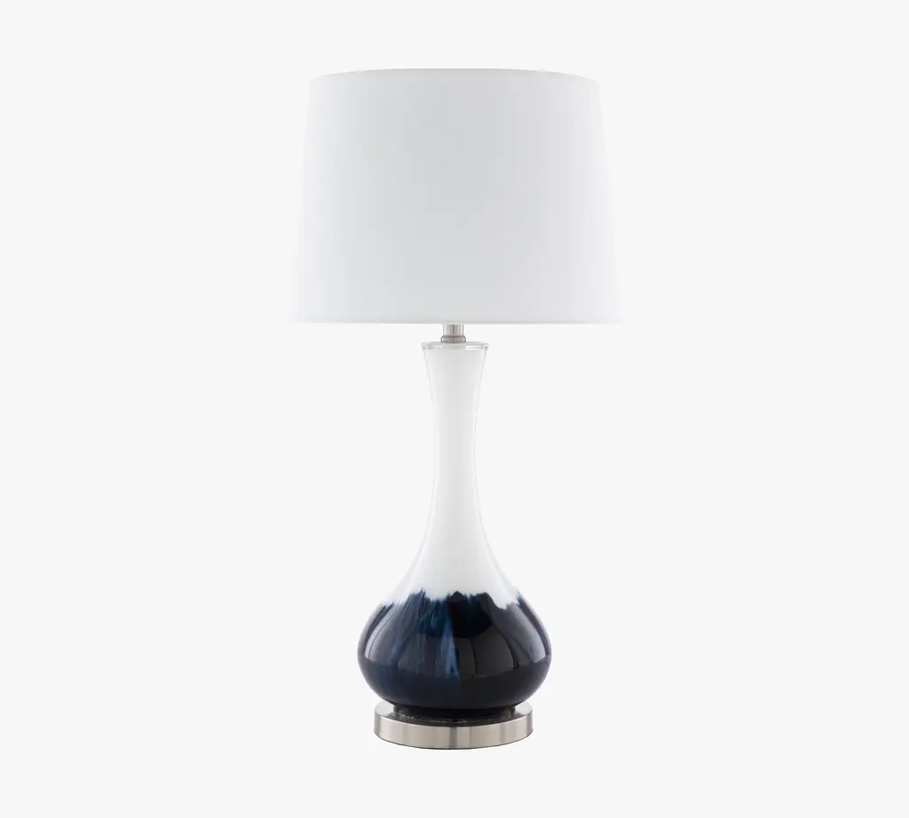 A classic color combination is reimagined in a fresh contemporary pattern with our table lamp. Chalmers is expertly crafted of handblown glass and finished in navy and white with an eye-catching ombre effect that conjures the summer sea and sky. The elegant base rises to the white linen shade for an intriguing textural counterpoint and tailored finishing touch.