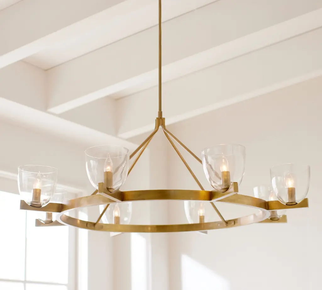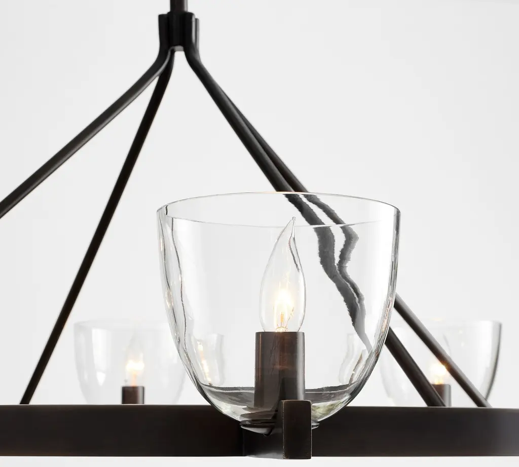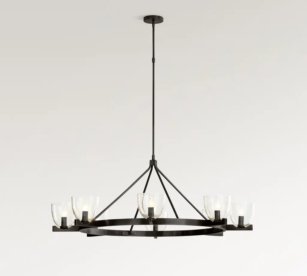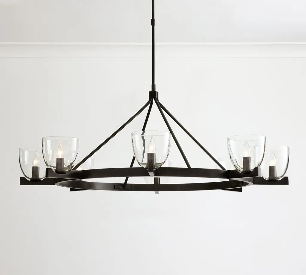 Curves and crisp lines combine for a fresh silhouette that works for a casual space or something more modern. Broad, cloche-shaped shades are sized and spaced on the solid metal frame to make the design feel more airy and open. It’s a substantial silhouette that still breathes.