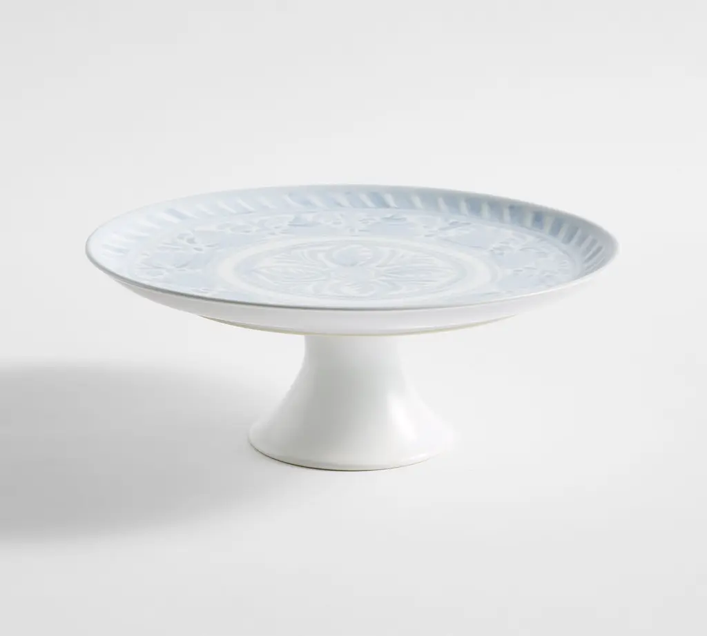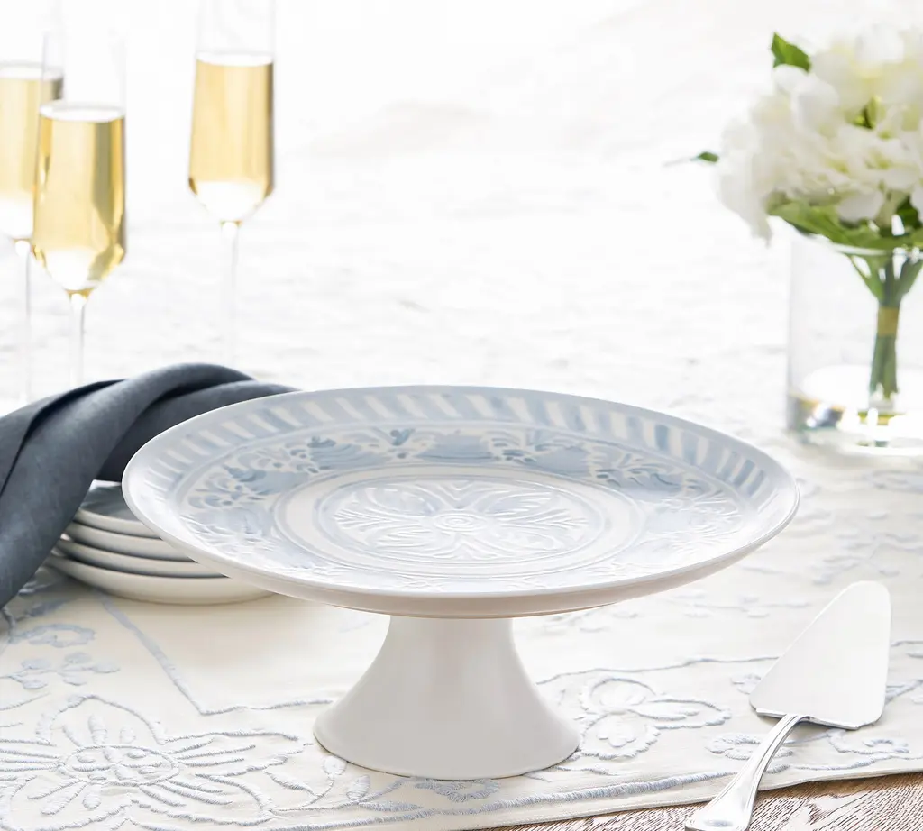 With dynamic, global-inspired designs rendered in tranquil tones, our Chambray Tile Dinnerware Collection is made for the collected yet considered home. Using elements like negative space and rhythmic patterns, the cake stand's design was hand painted by our in-house artists then digitally translated on stoneware to retain the unique brushstrokes and indicators from the original.