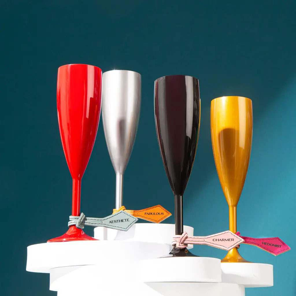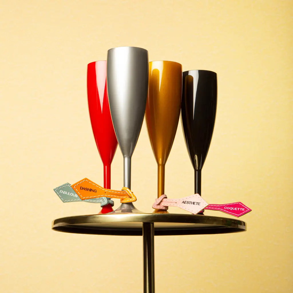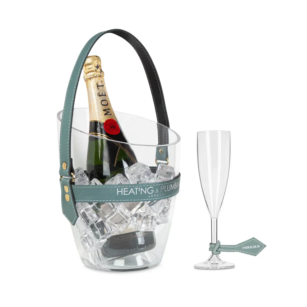 Create an unforgettable party with this fun & colourful Champagne Party Toolkit! The set comes with a bucket to keep your favourite Champagne chilled to perfection & a matching set of glass charms to get your party swinging!The Champagne bucket has a carrying strap, making it easy to carry for an indoor or outdoor gathering. The charms are designed to be attached to the stem of each glass, so they don't get mixed up. Charm personalities: Fabulous, Dapper, Siren, Charmer, Coquette, Aesthete, Dashing, Hedonist. Who’s the dapper one? Who's the coquette? They are also a fabulous ice breaker. The charms come in a beautiful matching pouch. The Champagne bucket carrying strap & the glass charms set are made in our London workshop from genuine veg-tanned leather.