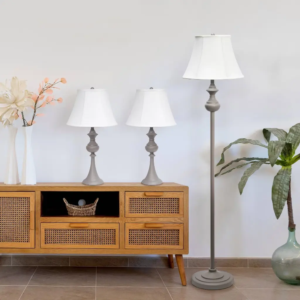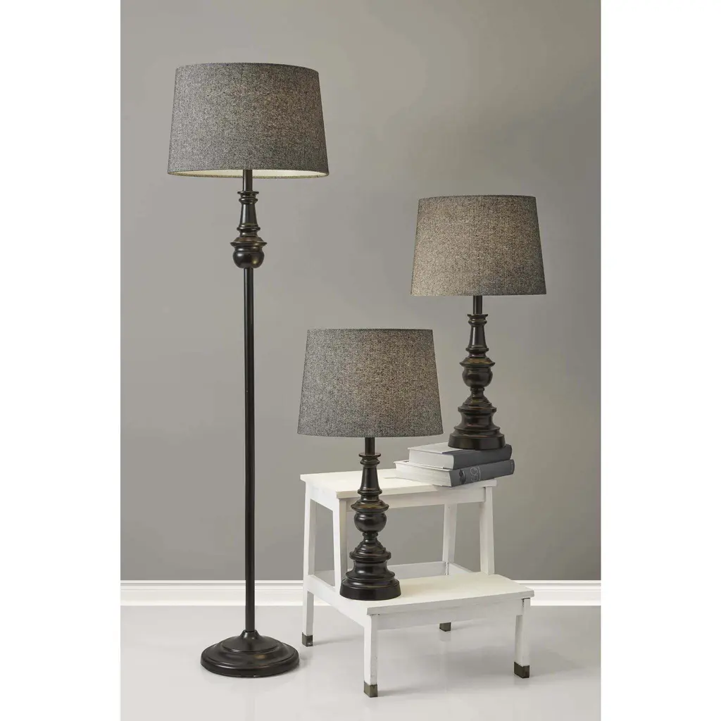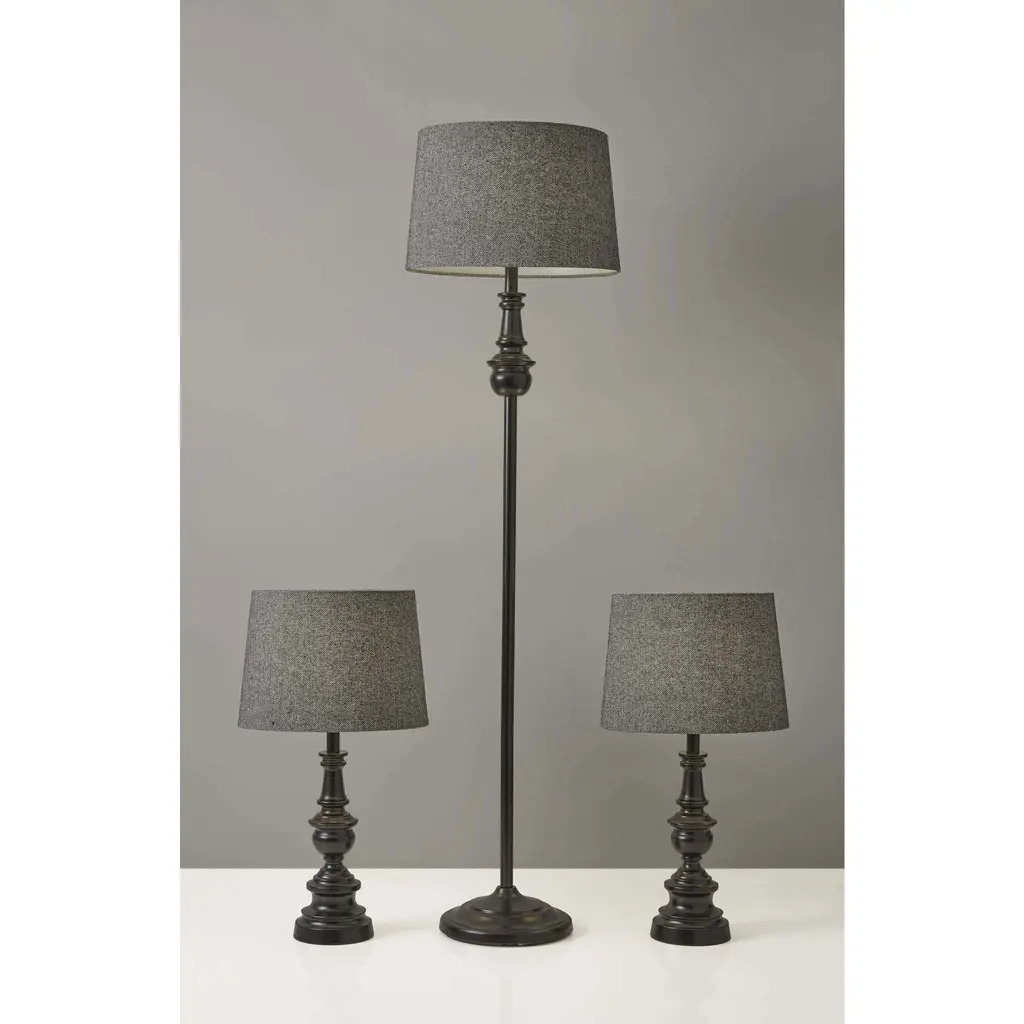 This beautiful bronze lamp set will make the perfect addition to your home. It comes with two table lamps and one floor lamp. The lamp set has a nice dark bronze finish. Atop the base is a textured herringbone hardback taper drum shade. Each lamp takes a 150 Watt bulb or LED/CFL 3-way equivalent.