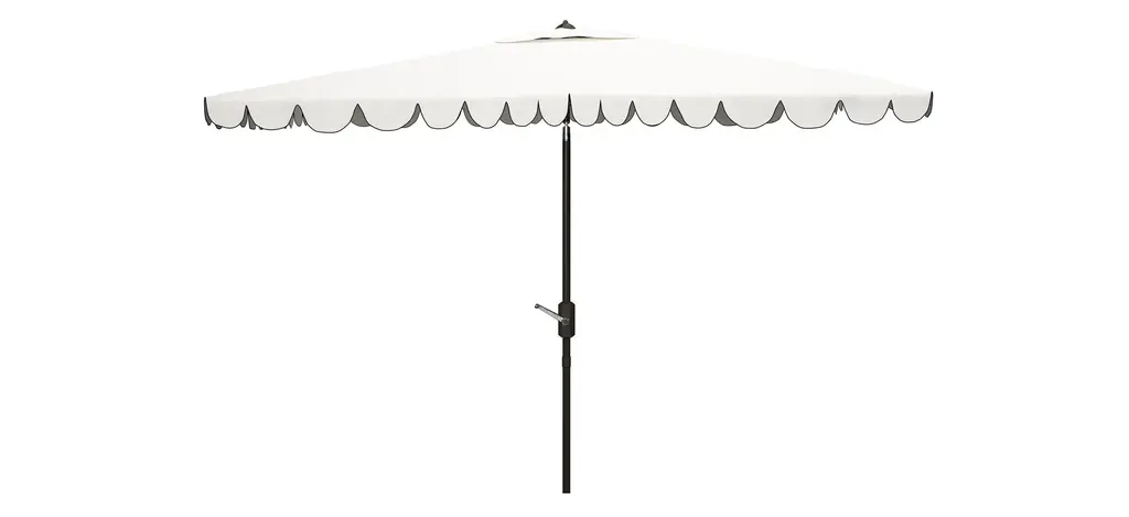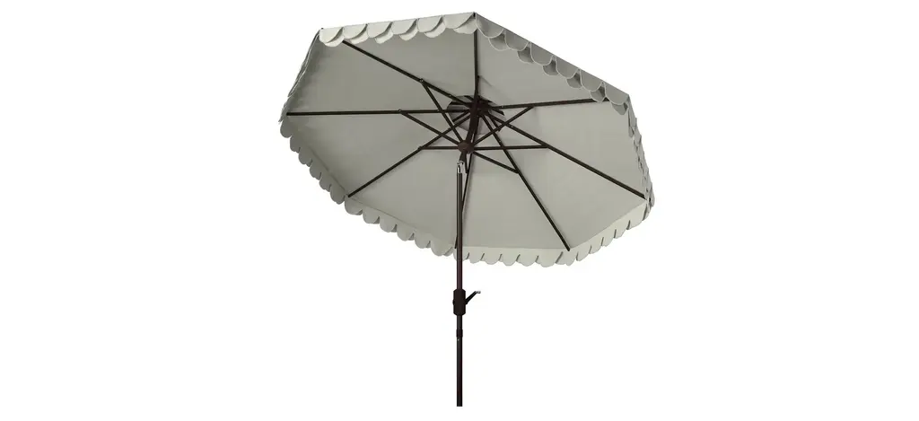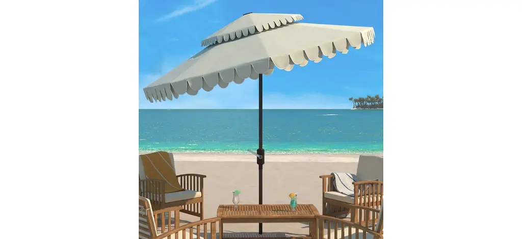 Offering a second home to jetsetters and cinema stars, a legendary beachside resort at Cannes inspired this elegant round nine foot umbrella. With a double top and petal valance finished in neutral beige and white, it recalls the inimitable red carpet glamour of the Cote d'Azure.