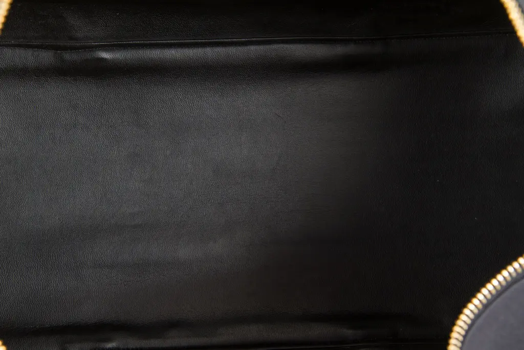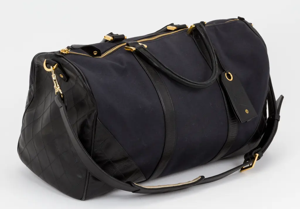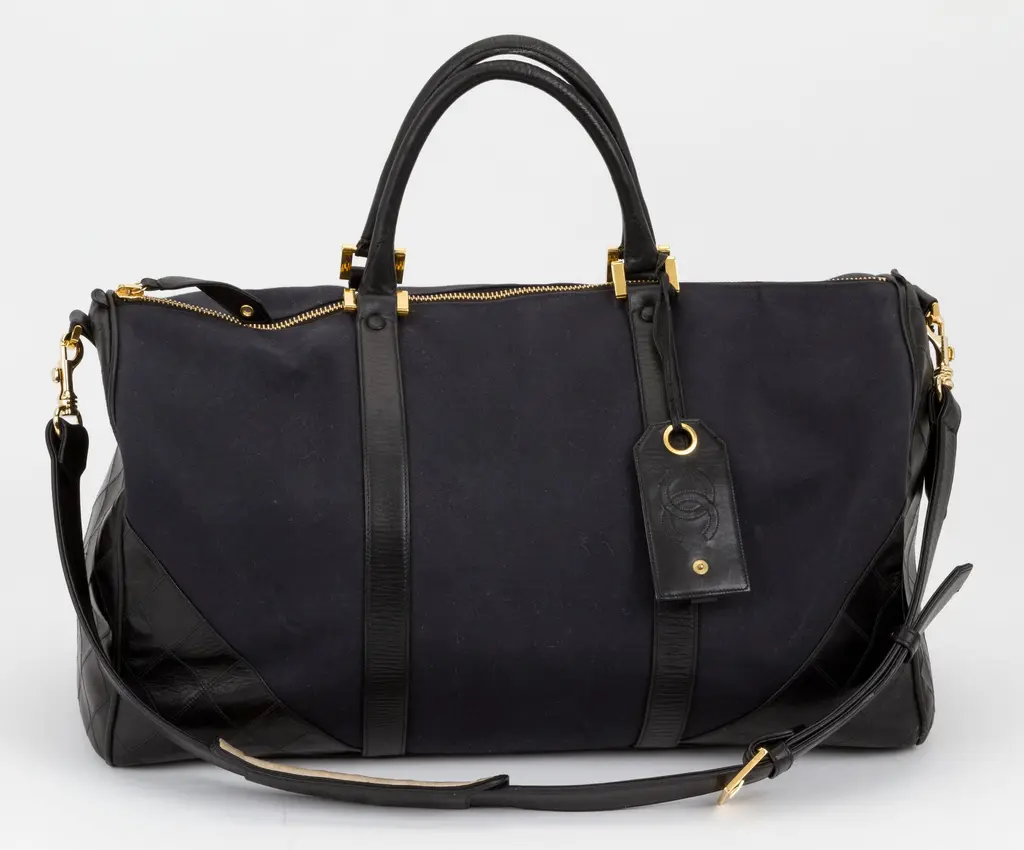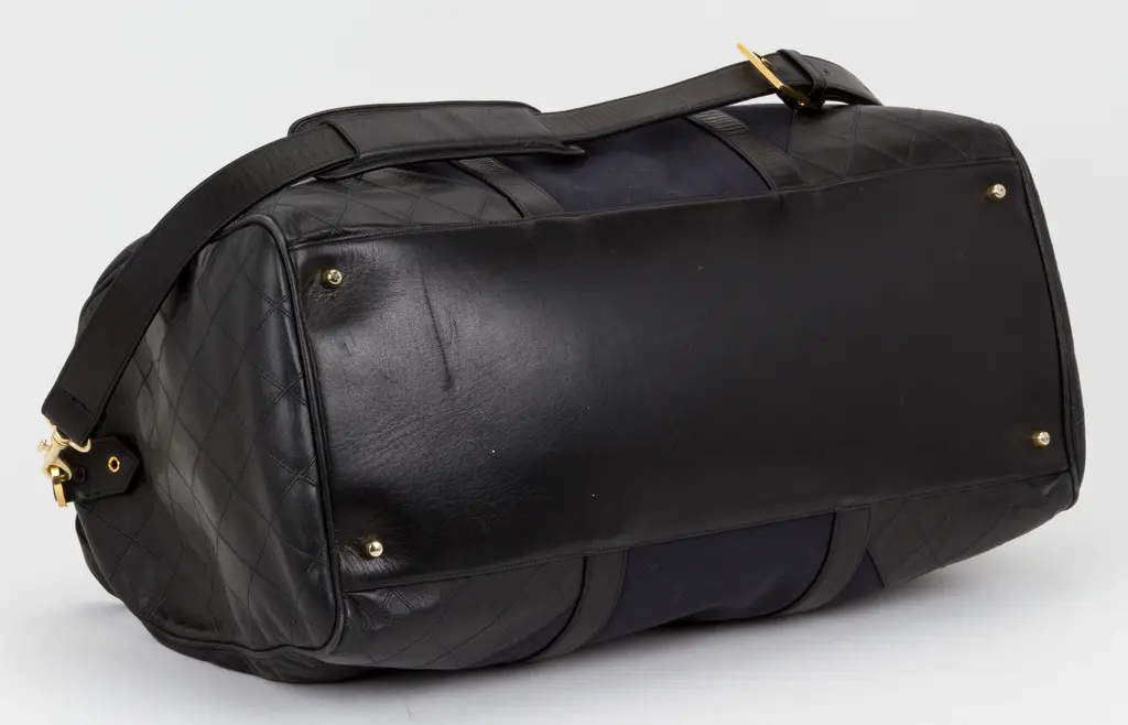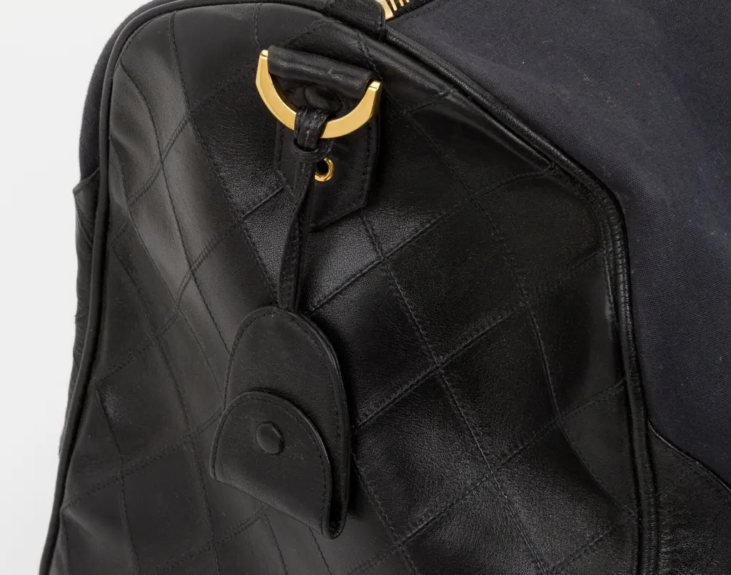 Chanel late 80s early 90s canvas and leather quilted duffle bag. Gold tone hardware. Handle drop 6.5". Detachable strap measures 44". Small glue residue on top, interior smell due to years of non use. Original Chanel name tag holder, key holder, 2 keys, logo lock. Comes with hologram and id card.