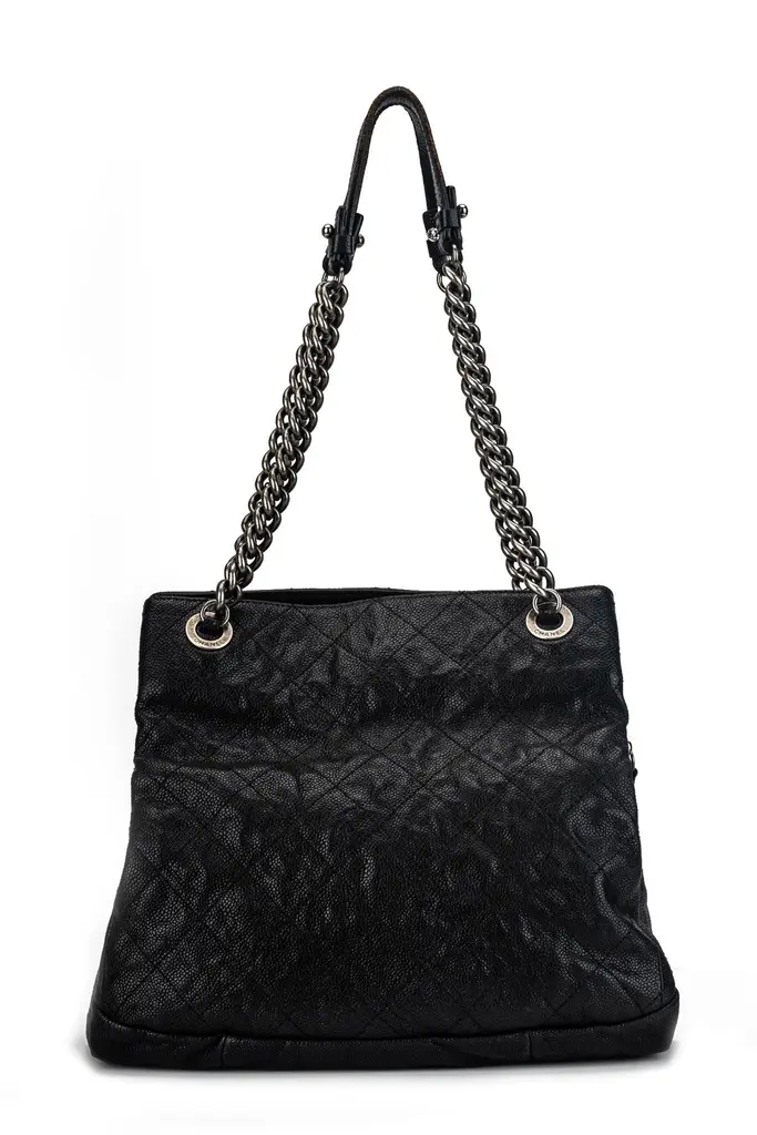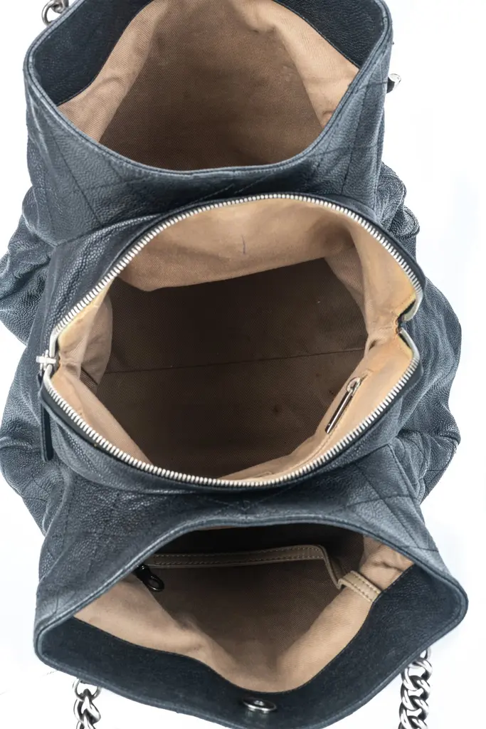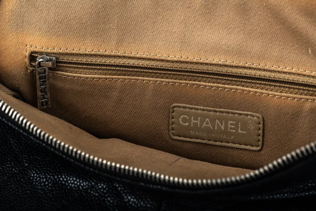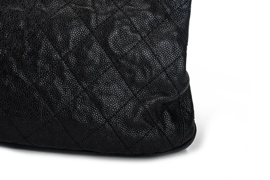 Chanel black caviar lambskin leather with silver tone hardware. Shoulder drop 10". Generic